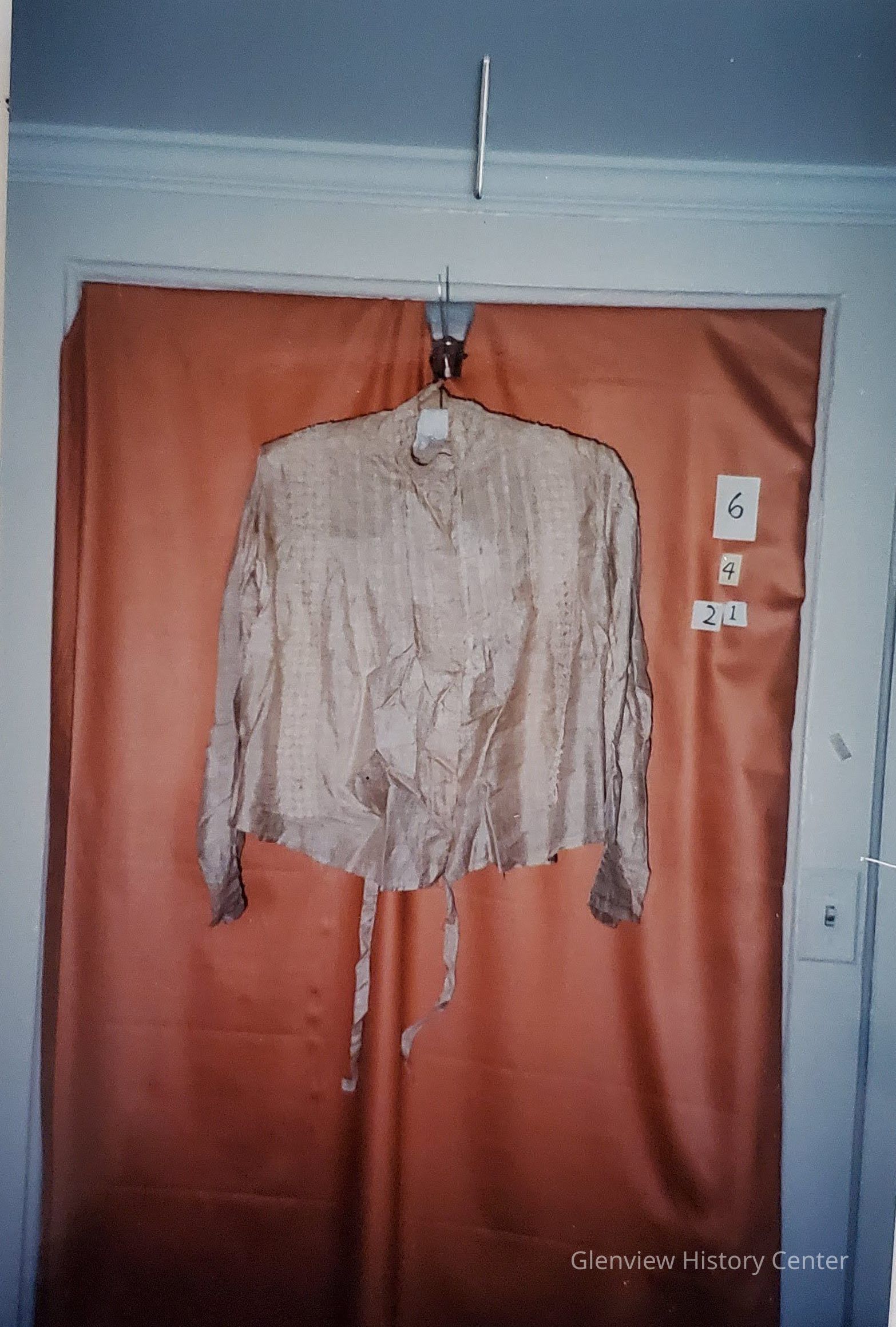 Beige silk pongee blouse with cotton lace stand-up collar (Mandarin) 1-1/2" in height and 13" in length. It has a hand basted rolled hem on silk pongee; secures cotton lace of dramond which covers entire collar. Extension tab of 6" that secures collar an inch beyond back center shoulder seam. On the left collar edge is a 5-1/2" silk pongee 1" wide that secures behind tab of lace extension of collar on right side. Center front button close 19" in length and 1" machine stitched lining on center front. Four buttons 1/4" in diameter and begin 3-1/8" from collar edge. On right side of center front is a tuxedo front of 1-1/2" in width machine stitched 1/4" on both sides of placket enclosing 1" button holes extension of center front concealed button holes. There are 5 tucks on bodice neckline and shoulder line 1/4" in width and 8-1/2" long and 8" long. Beyond these 5 tucks is a vertical panel of cotton lace 1-3/4" wide and 18-1/2" in length and is hand stitched to blouse front. Length of blouse at center front 19-1/2". Long puffed sleeve 17" in length from underarm seam.Self cuff 3" in width and 8-1/4" long and is secured with 2 metal hooks and 2 thread loops. 3 tucks 1/4" in width circle cuffs rolled hem machine stitched. Center back has 3 tucks on both sides that create a V from shoulder to waistline and are 14-5/8" long. Where the V comes together at waistband the blouse is gathered in with a 3" X 1" machine sewn tab. On each extension of the tab is a tie 5/8" wide and 19-1/2" long and machine stitched self fabric. Below the tab is gathered fullness of blouse. Top of tab are metal loop on each corner. Plain side seams and at sleeve arms-eye. Rolled hem machine stitched 1/4" in width.Acquisition