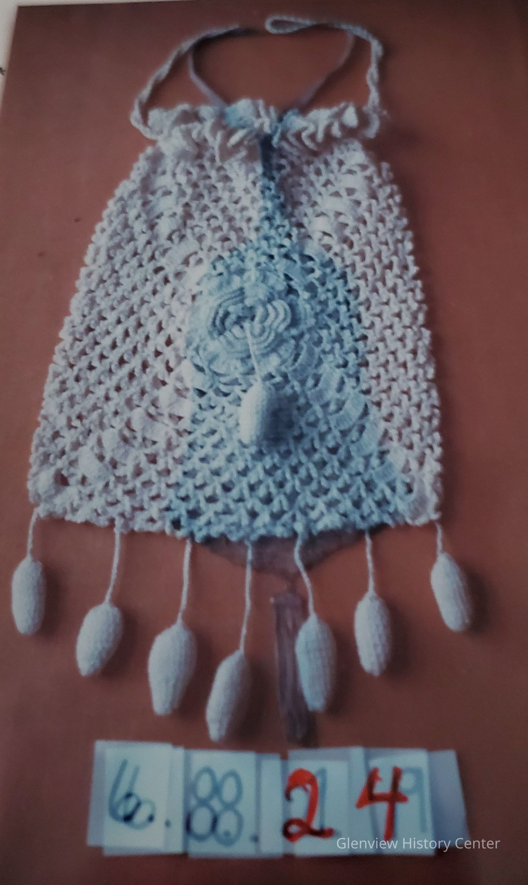 Large open crochet creme colored rose center with one center acorn; 7 acorn dangling fringe drawstring satchel.