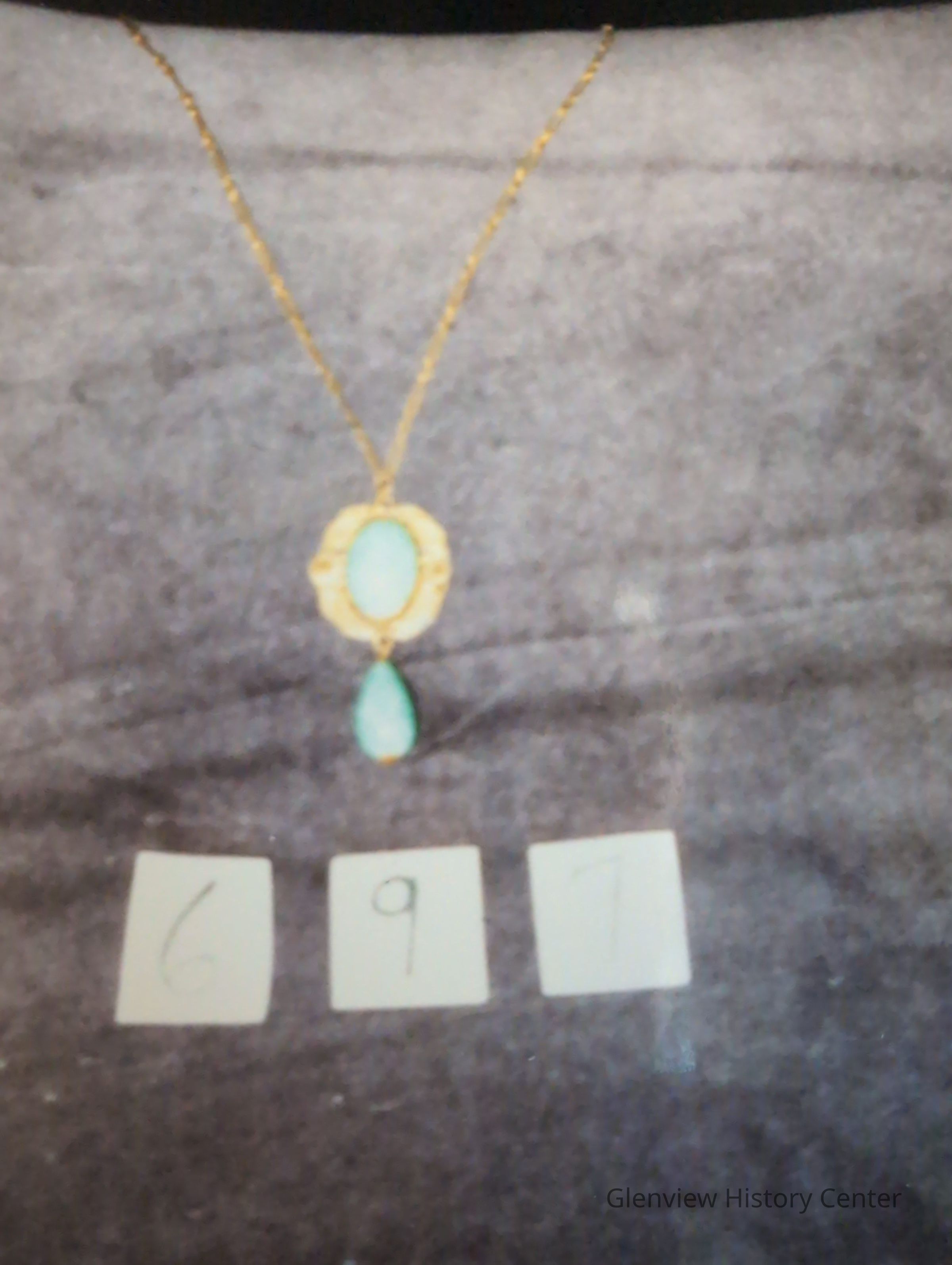Gold chain necklace with gold lavalier with green stone in center and green stone pendant