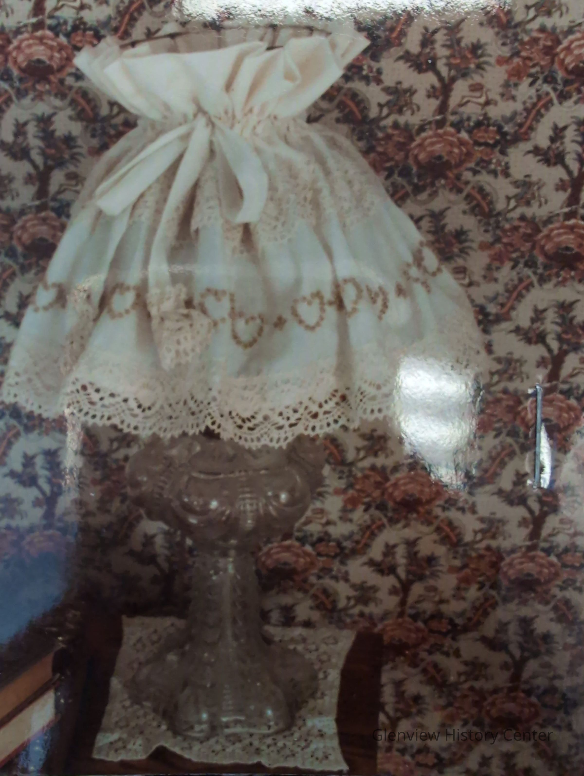 Clear glass pedestal lamp with Lincoln Drape of white cotton shade with lace hem and repeating French knot heart shape