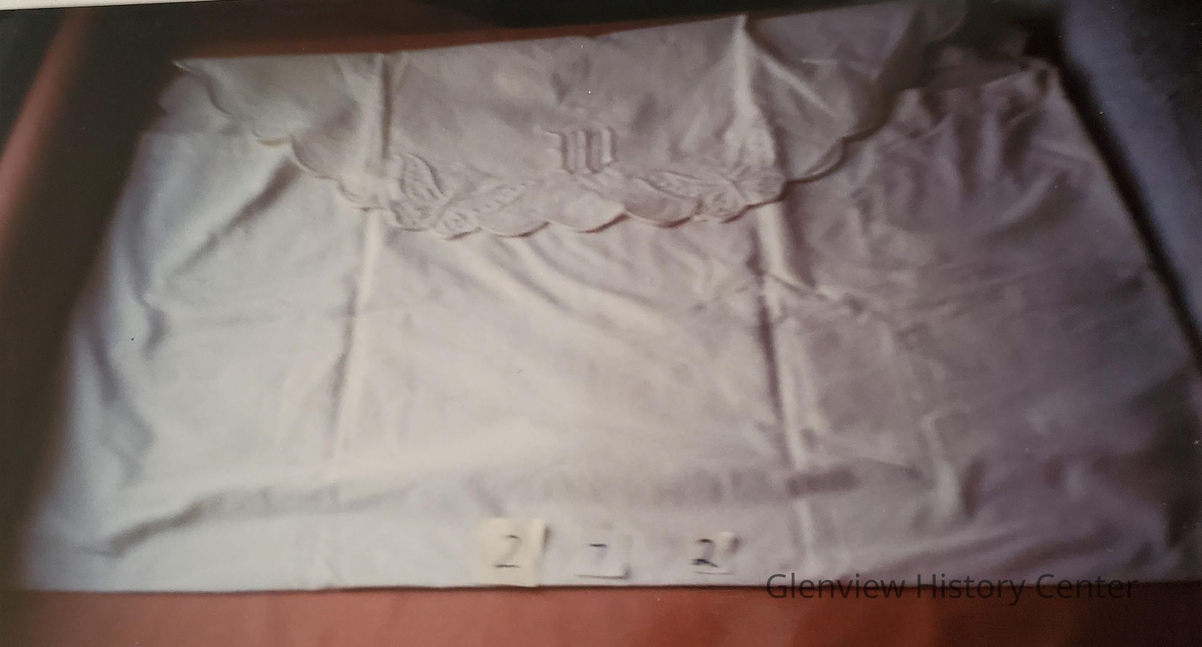 White linen envelope style case. Flap of case is scalloped with satin stitching - Two butterfly designs with "W" monogram.