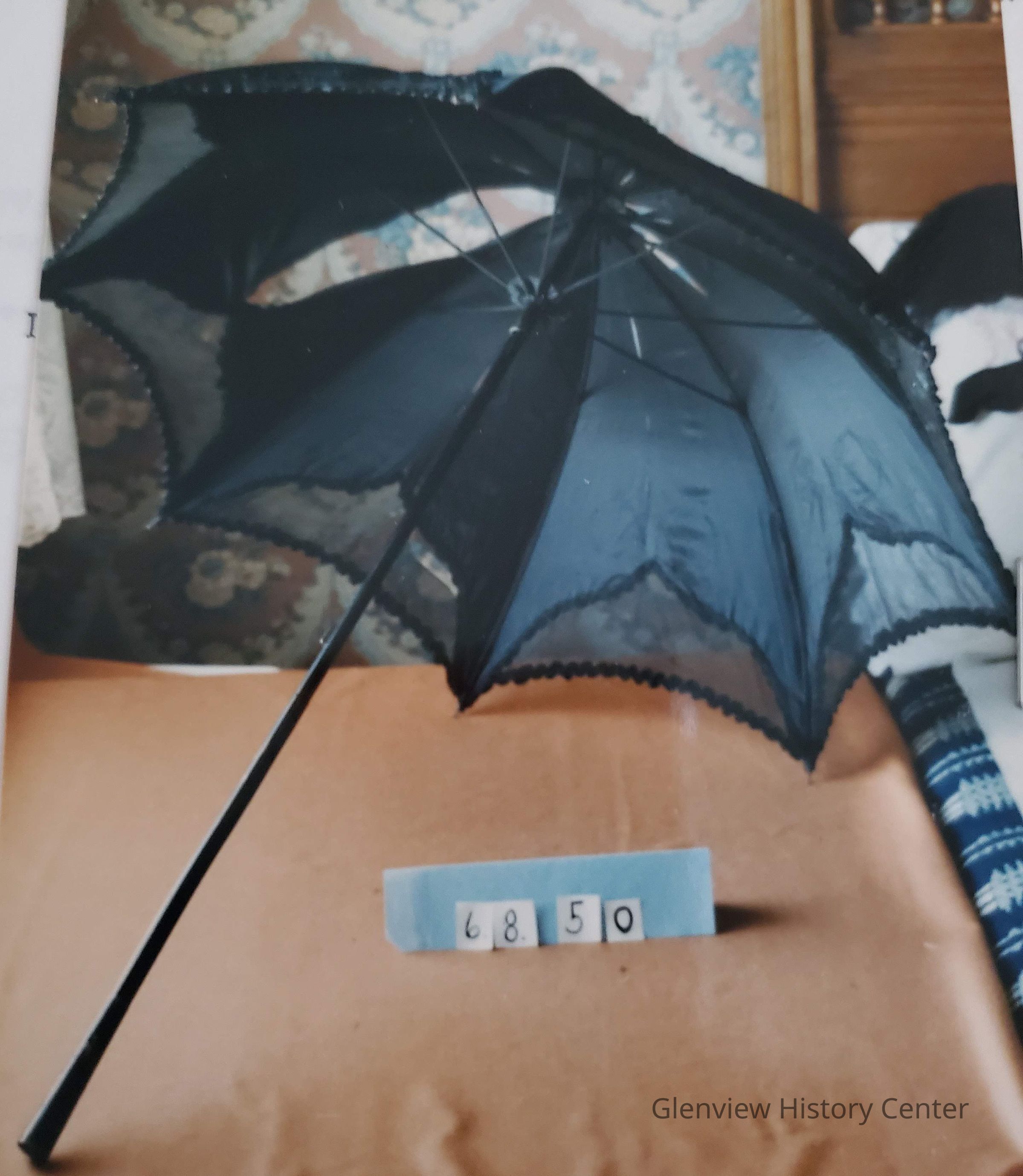 Black organdy and taffetta, satin ribbon in waved design, decorative ribbon bow design between ribs, metal handle.