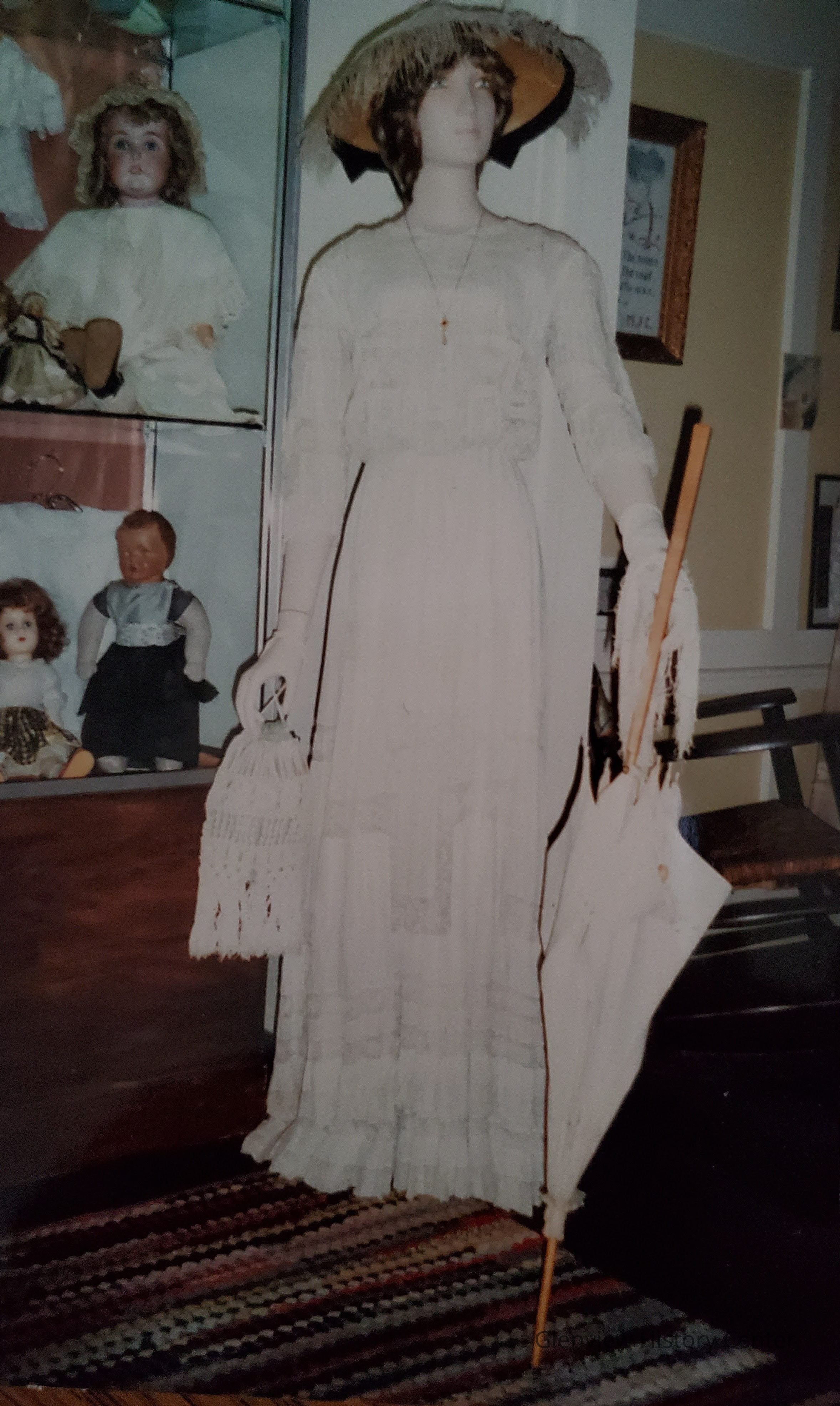 Ecru summer dress, very elaborate net, embroidered, long sleeves, 3 flounces at bottom, very long back vent with hook and cloth eye closure, 3 tiny pearl buttons at neck back.Acquisition