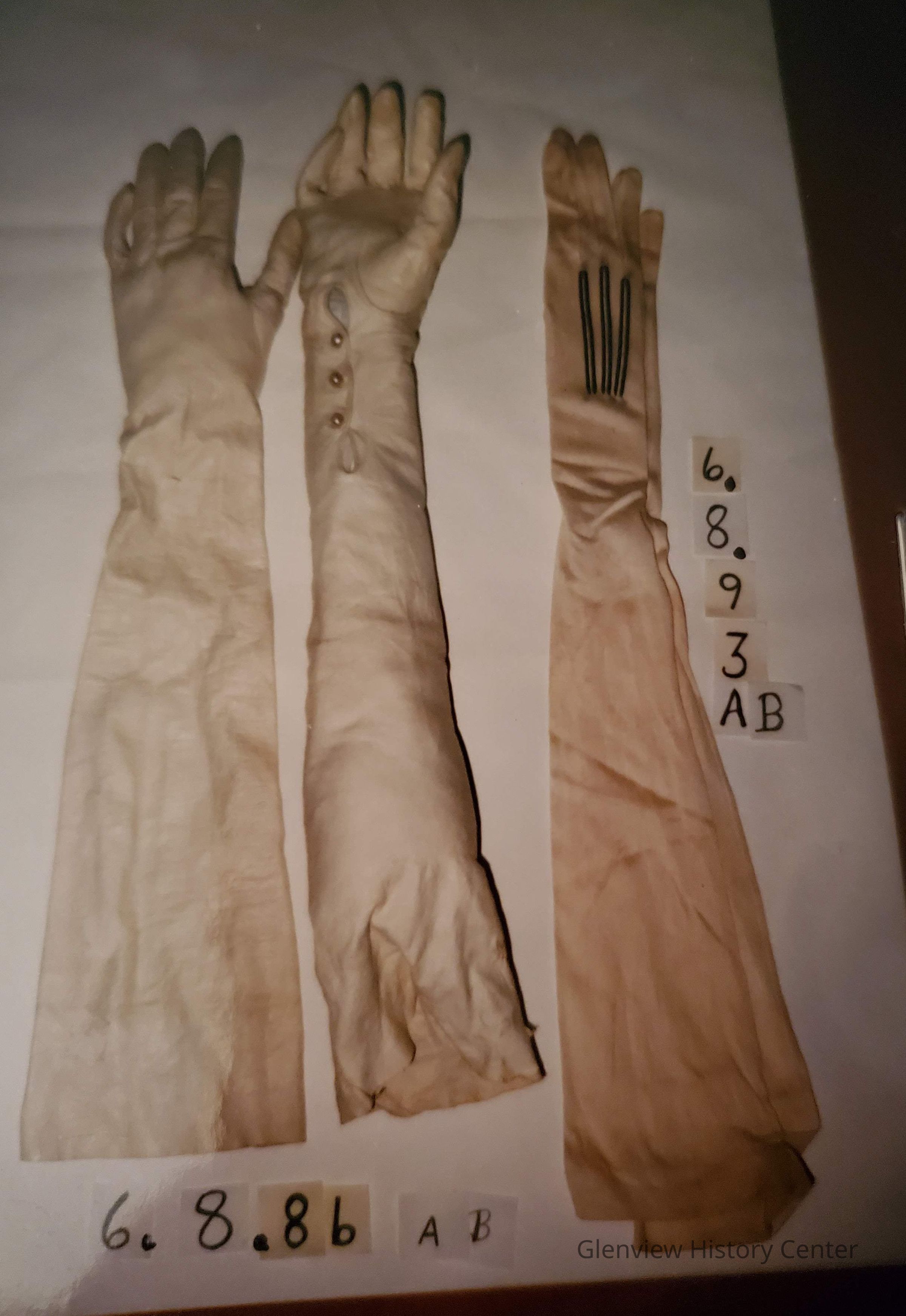 Long silk knit formal gloves of a creamy whitish color, black stitching in three rib pattern on hand back, the black outline a cream stitch line. three snap opening on inner wrist snap backs covered with same fabric.