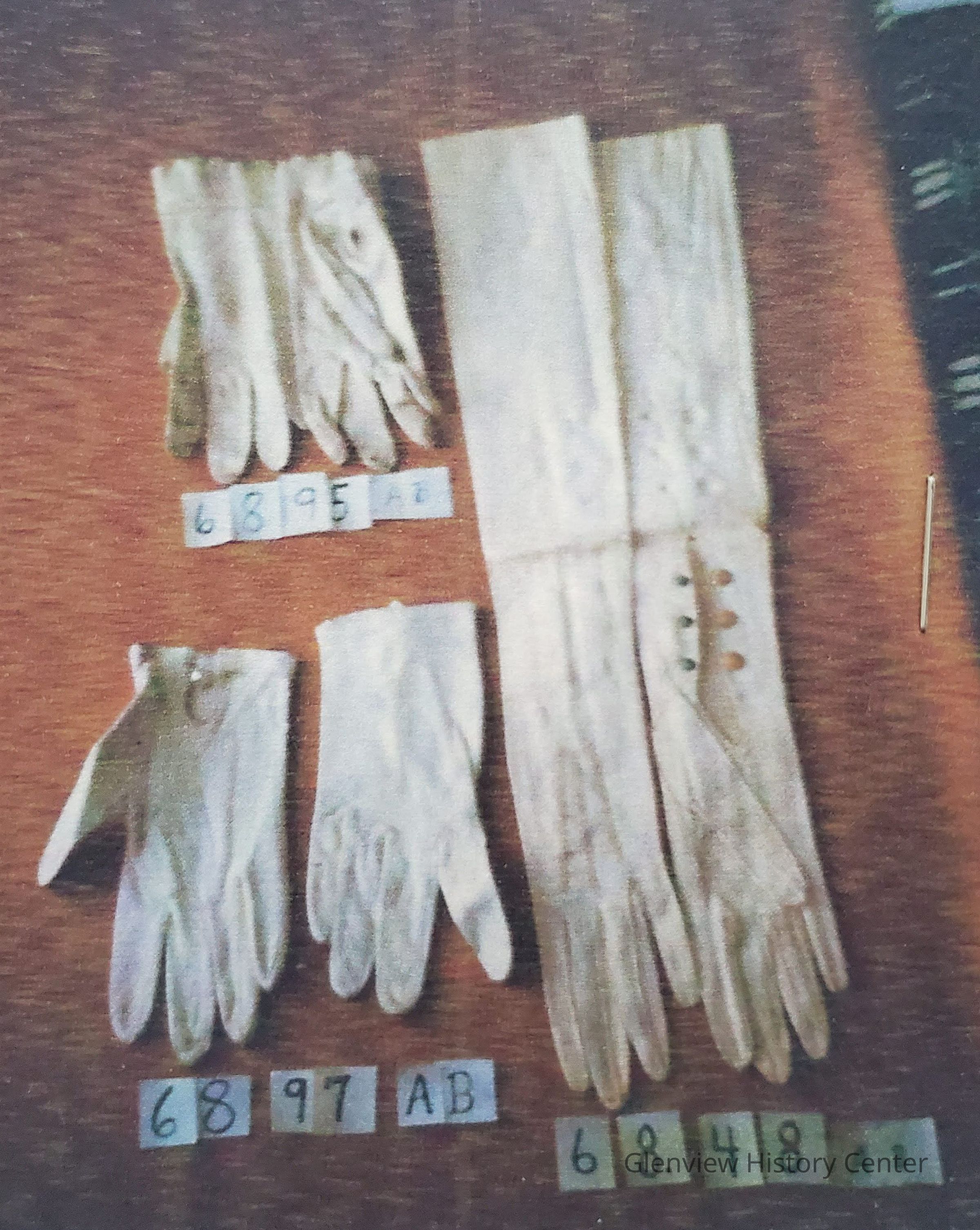 One pair of kid gloves in white slightly yellowed. 21-1/2" long. Opening at wrist is 4-3/4" long. Three 3/8" snap buttons in tan are along opening. Three strips of stitching 3/16" wide with lengths of 3", 2-3/4" X 2-1/2" decorate back above the finger.Acquisition