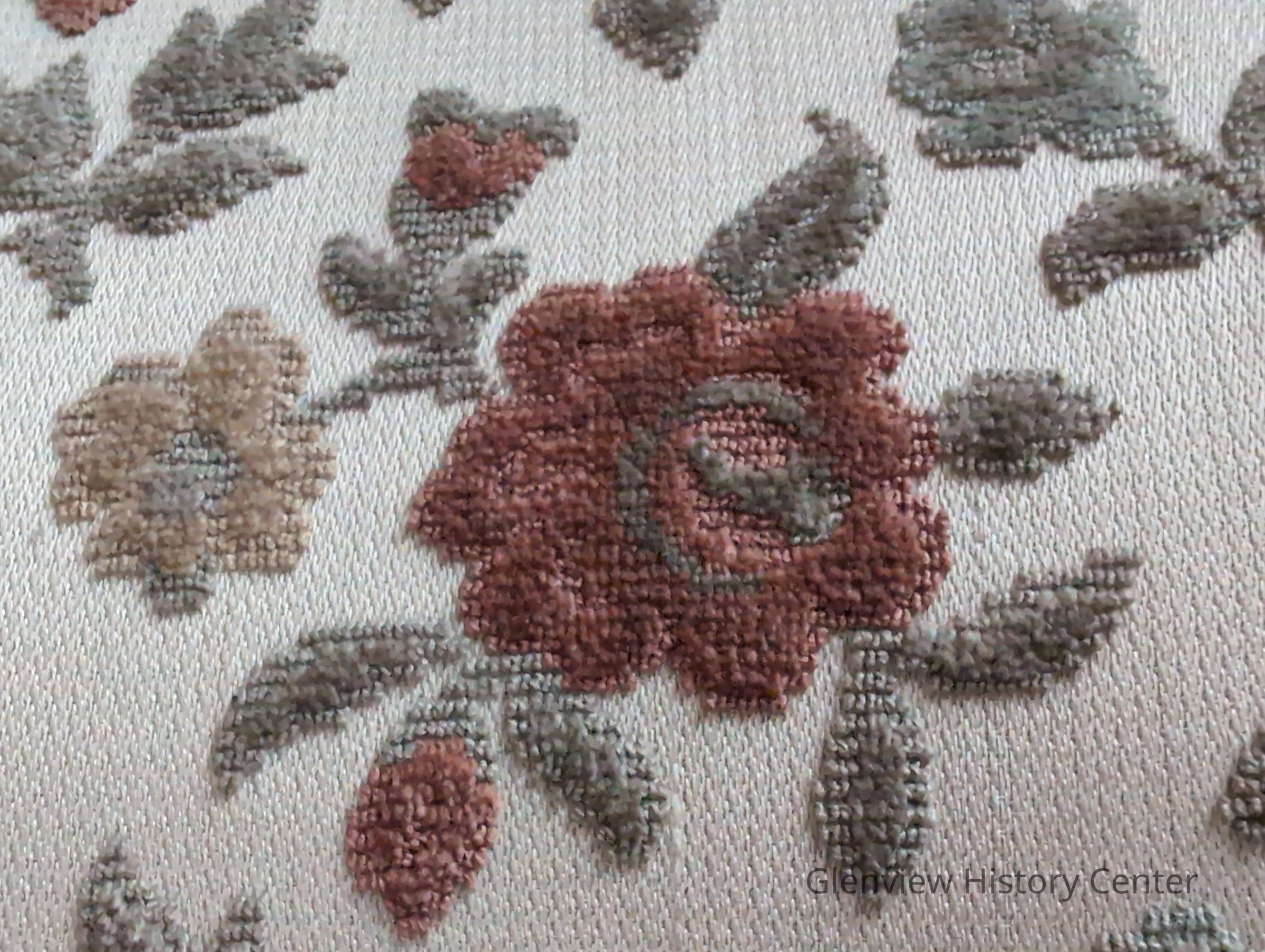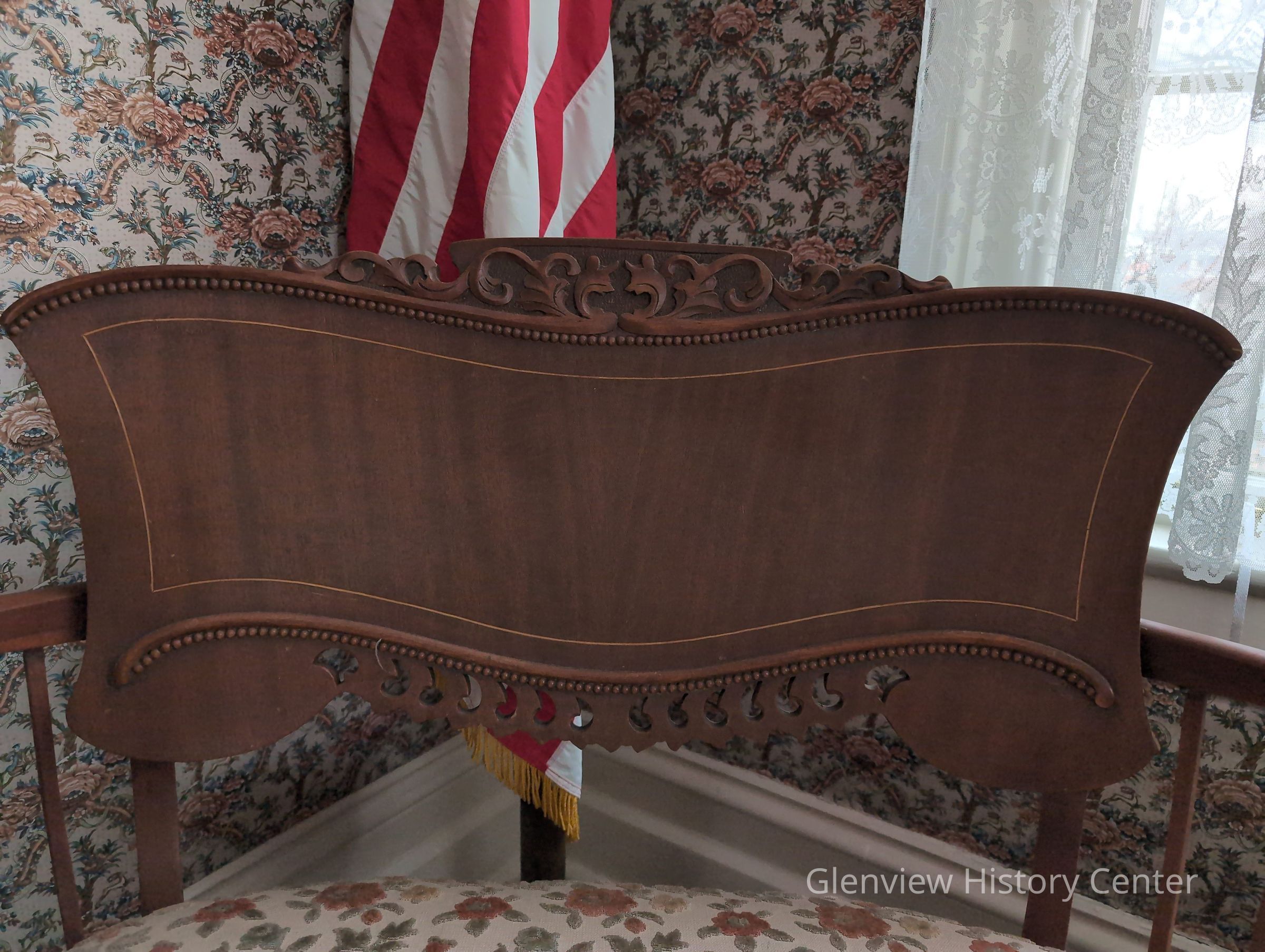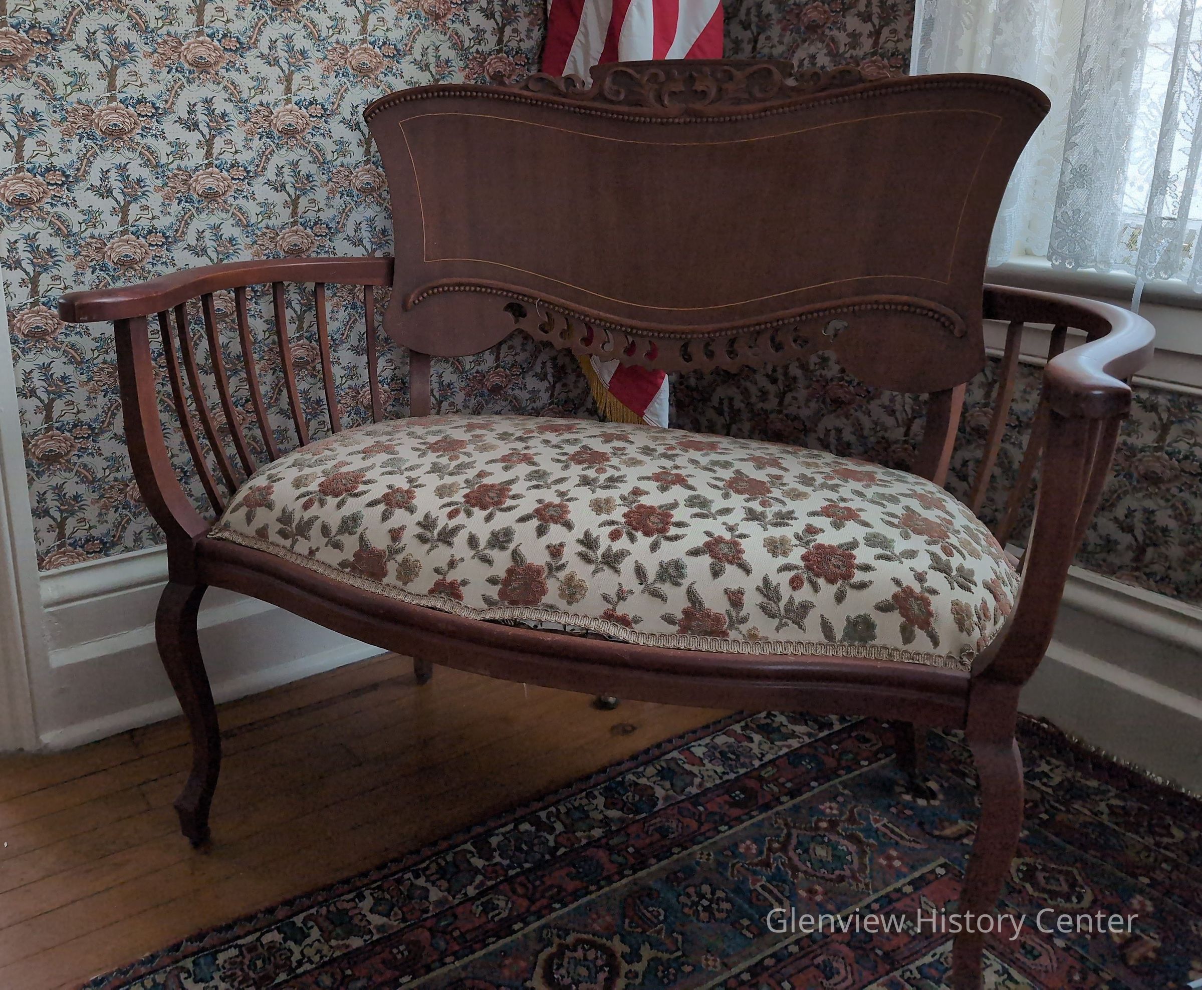 Art Nouveaux carved walnut loveseat with an upholstered cushion in a floral patternContext