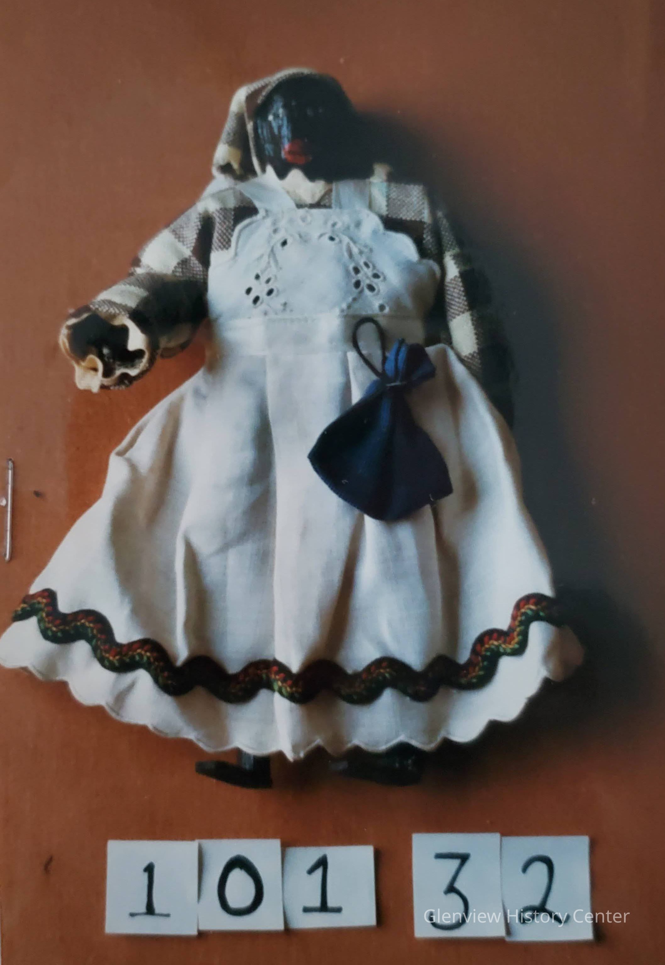 Mammy doll - brown and white check dress and bandana. White eyelet apron with bib-rick rack trim, scalloped hem edge of skirt; handmade and hand painted walnut face; right hand and feet are wood; no left hand carries a blue drawstring bag in right hand.Acquisition