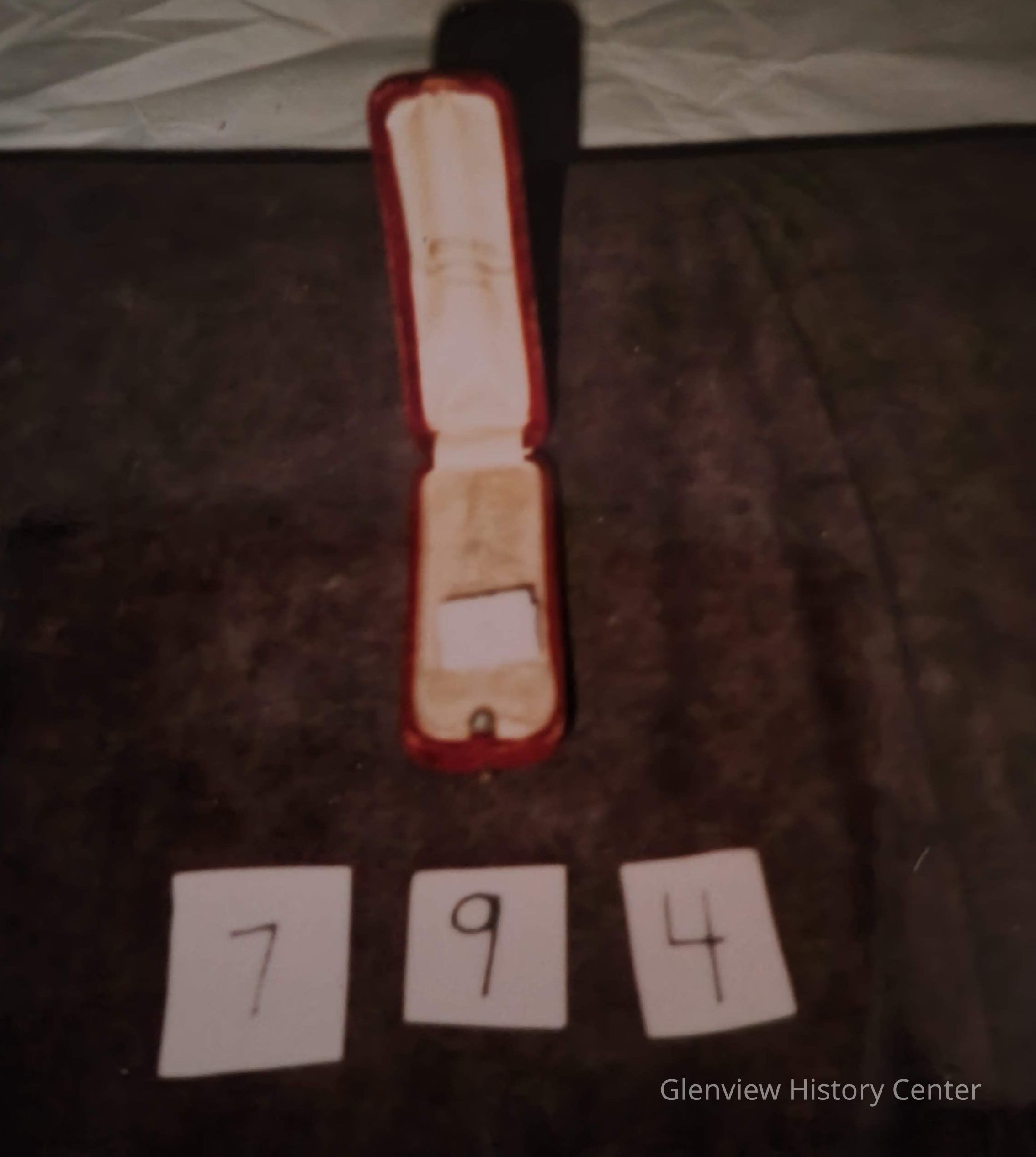 Maroon plush hinged box stamped "Budd & Co Reliable Jewelers, Chicago. Cream colored lining. Housed stickpins.