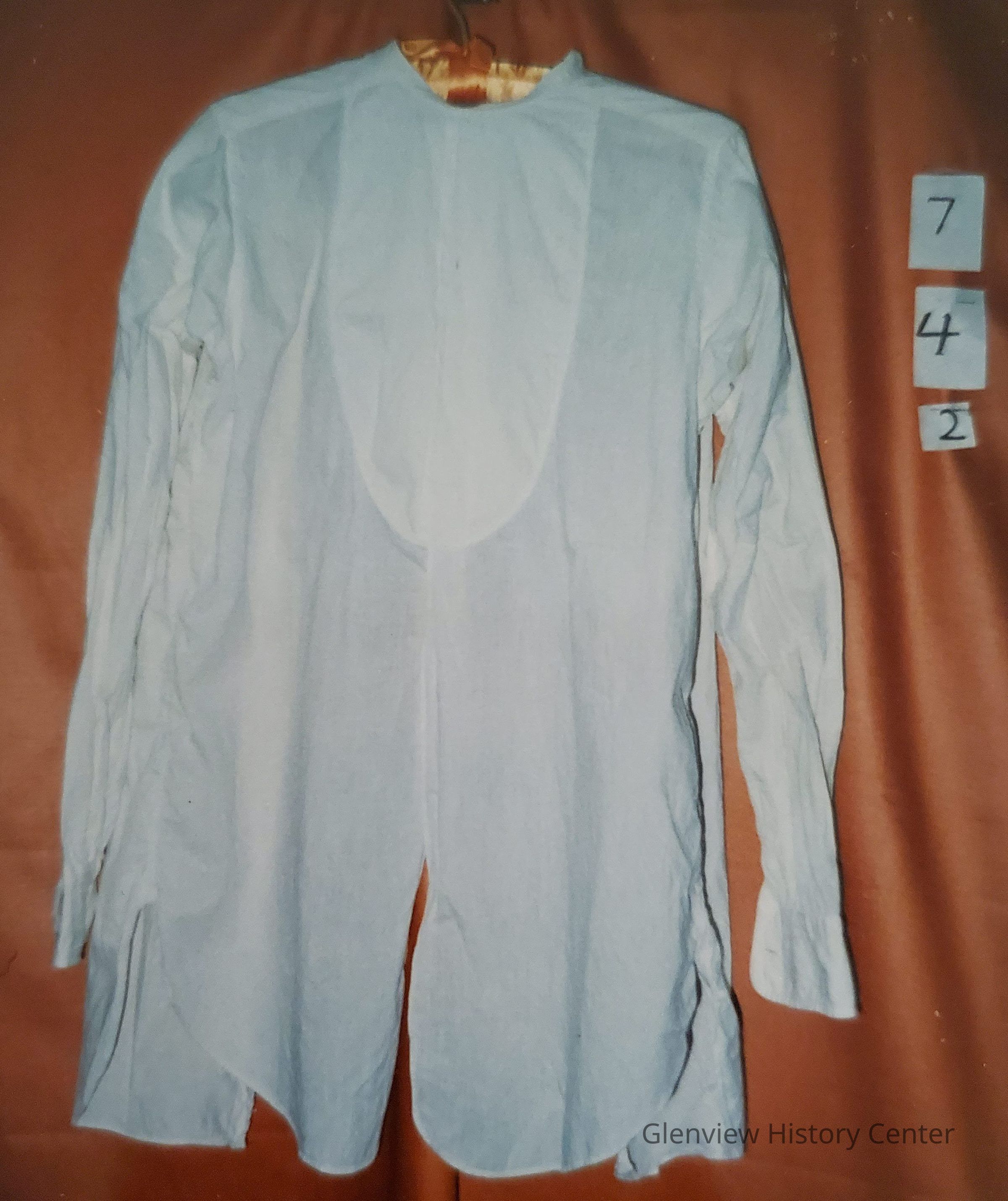Man's white linen formal dress shirt with white cotton pique bib and one button hole for stud. Opens up the back. Requires stiff collar and cufflinks. Long sleeves with pique cuffs.Acquisition