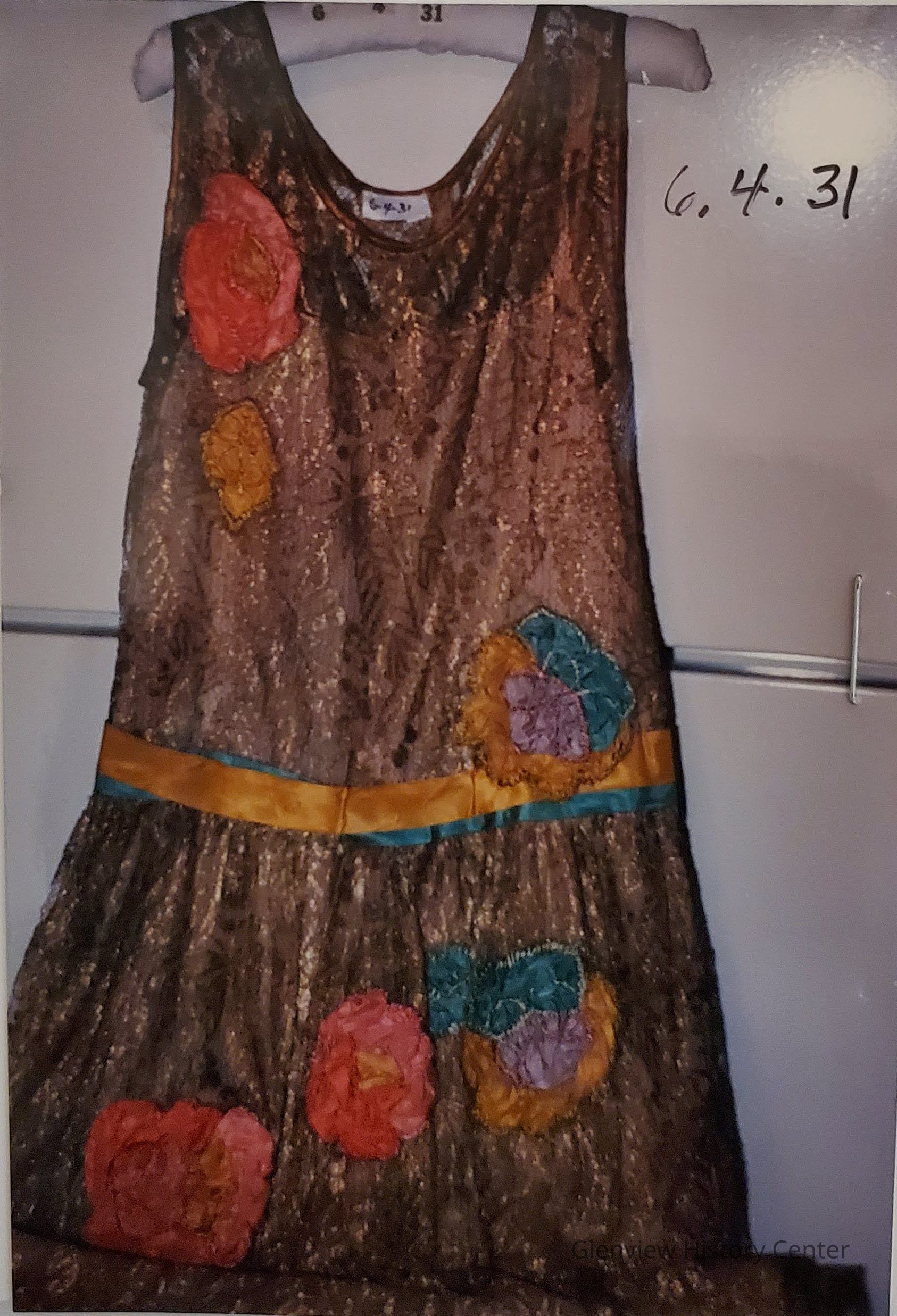 One sheer crepe of lavender organdy and heavier satin of mauve. Princess with drop waistline bias tape of 1/8" wide rolled for edge of scooped neckline and arms-eye sleeveless. Metallic gold mesh. Taffeta satin appliquéd 10 ornate colored flowers at front of dress and center back. Thin strap slip styles with double lining at bodice top. Left side close with 4 snaps and 2 hooks and eyes at waistband and 2 satin ribbons yellow green and aqua green. Bow at right hip double colors of green and ties of 17" in length and 1-1/4" in width. Yellow green is 22-1/2" in length. Scalloped hem with lace. Sheer organdy hem 2" in width. Satin is hemstitched.and 2-1/4" in width. Side seams for construction with rolled seams on organdy also on metallic lace.