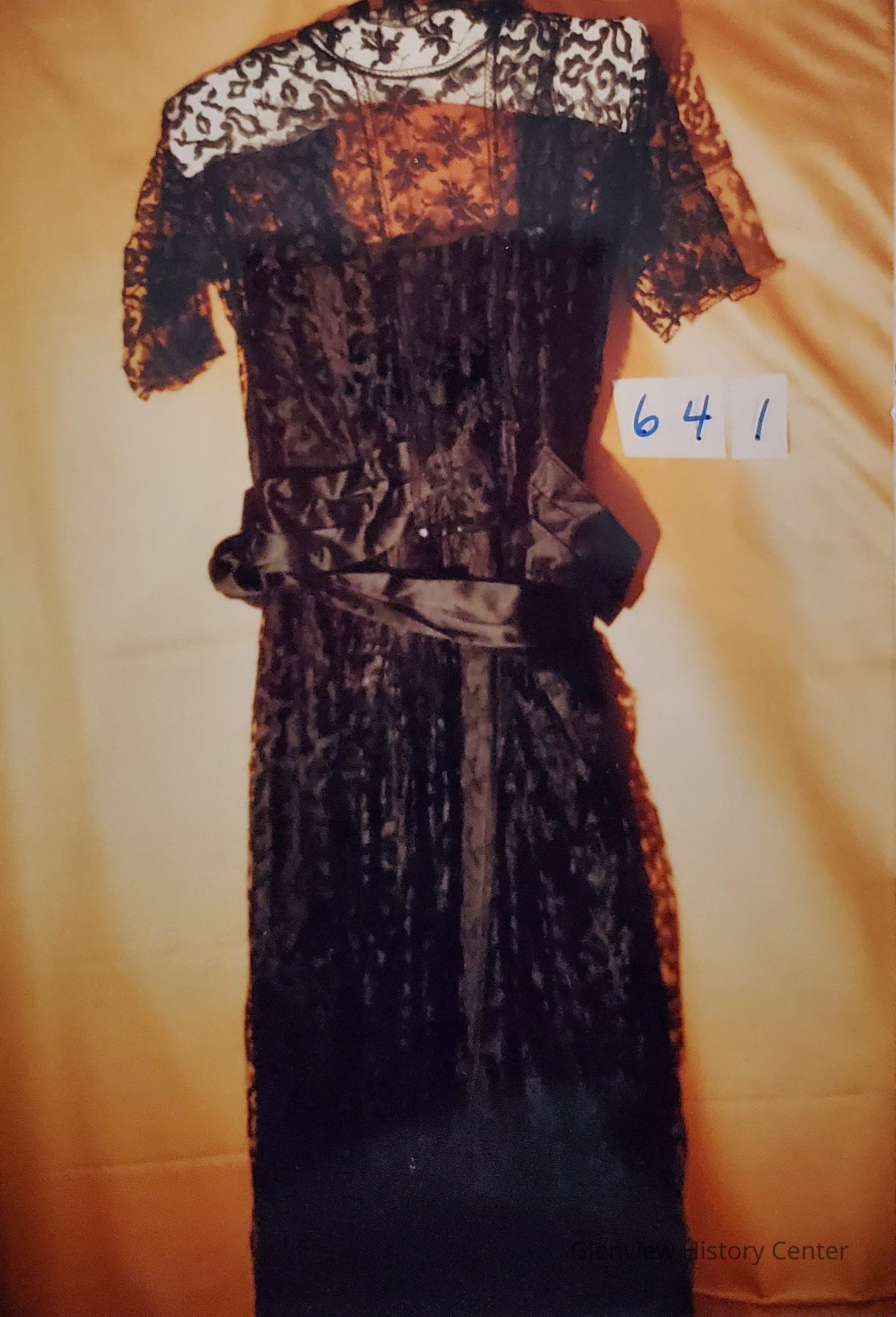 Black lace and black satin evening dress consisting of an under dress and over dress construction.