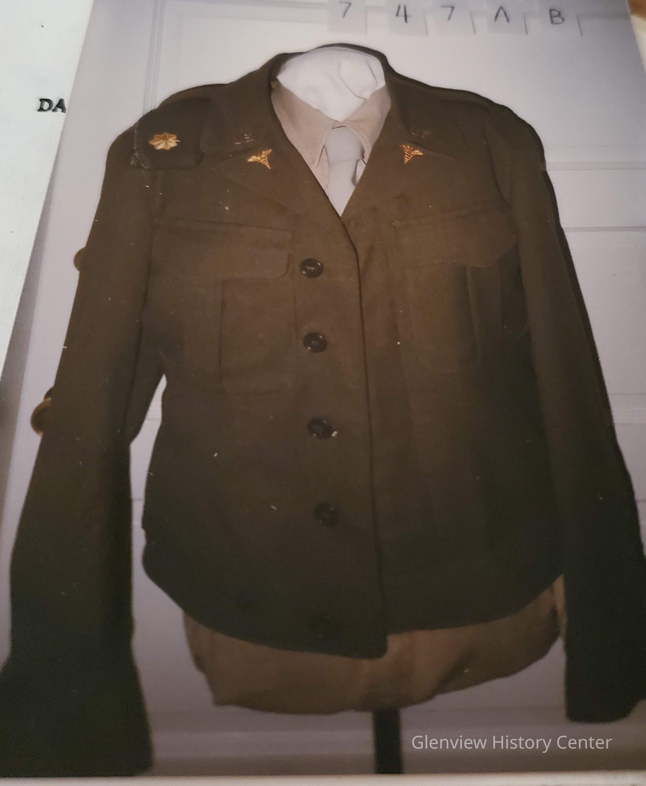 A. Wool Eisenhower Jacket, medical uniform; 5 bars on left sleeve; U.S. pins and US Army Medical Corps insignia (caduceus) pins on each lapel; red, white, blue star; unit badge on shoulder.