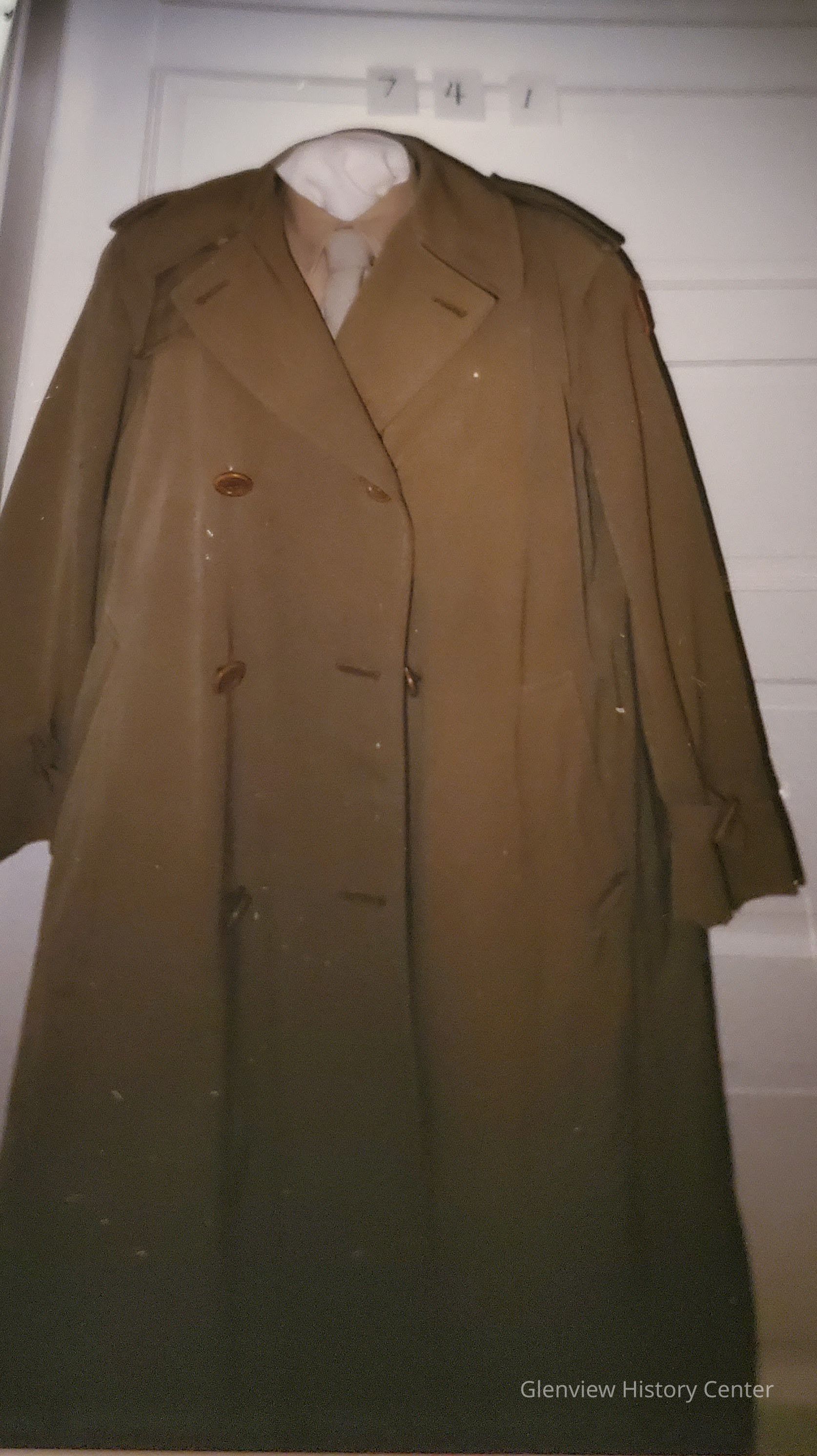 Wool Military overcoat, long: double breasted slash pocket; red & white, blue star bade on left shoulder.
