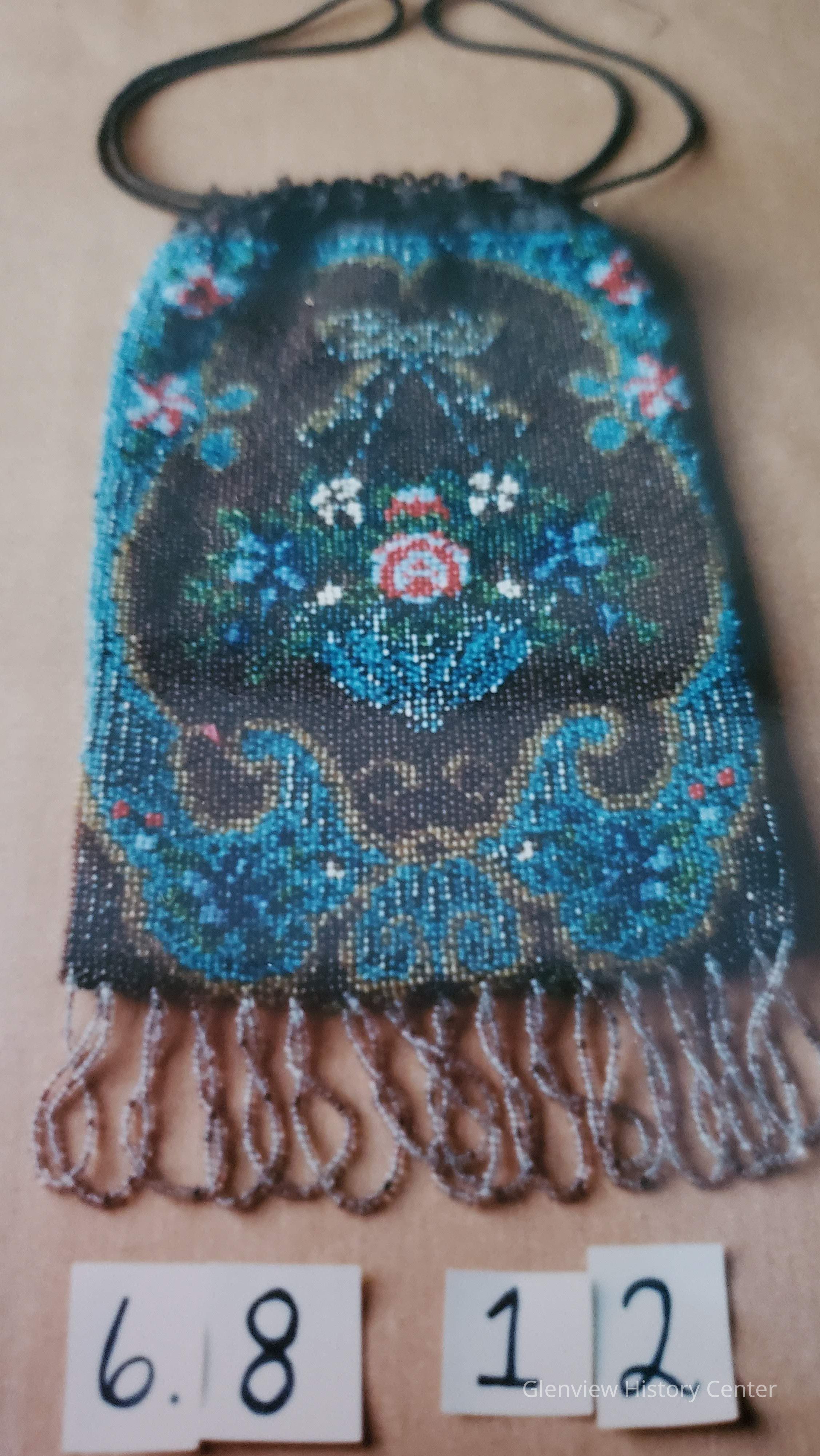 Multicolored glass beaded evening bag - satchel 8" long 6" wide - Brown cording for draw closing. Bottom edge of bag - 16 interlooping beige string bugle beads.Acquisition