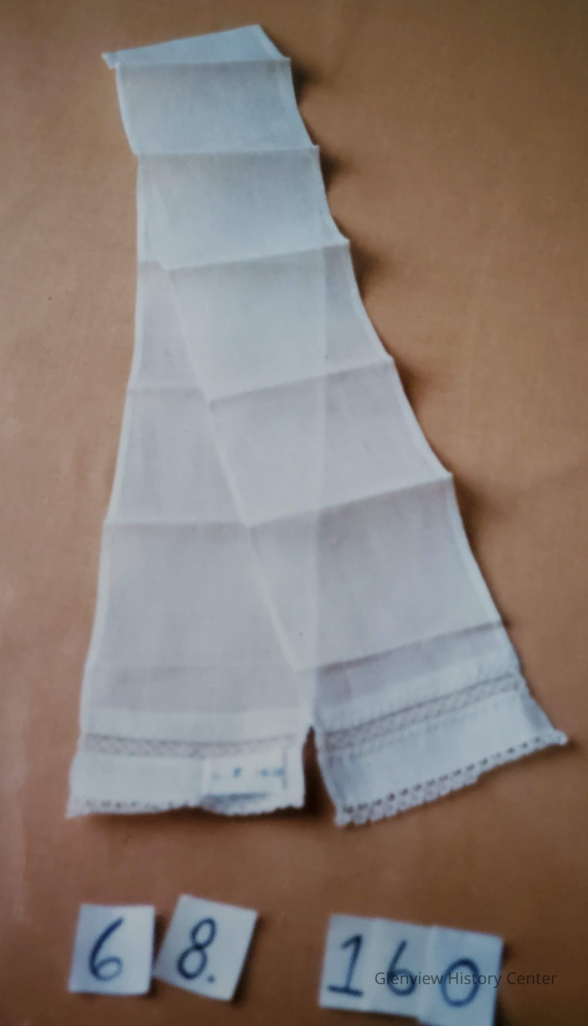 Three inch narrow fine linen scarf with hem stitched edge; beautiful tiny tatted edge and insert of lace with feather stitching done in white embroidery floss.