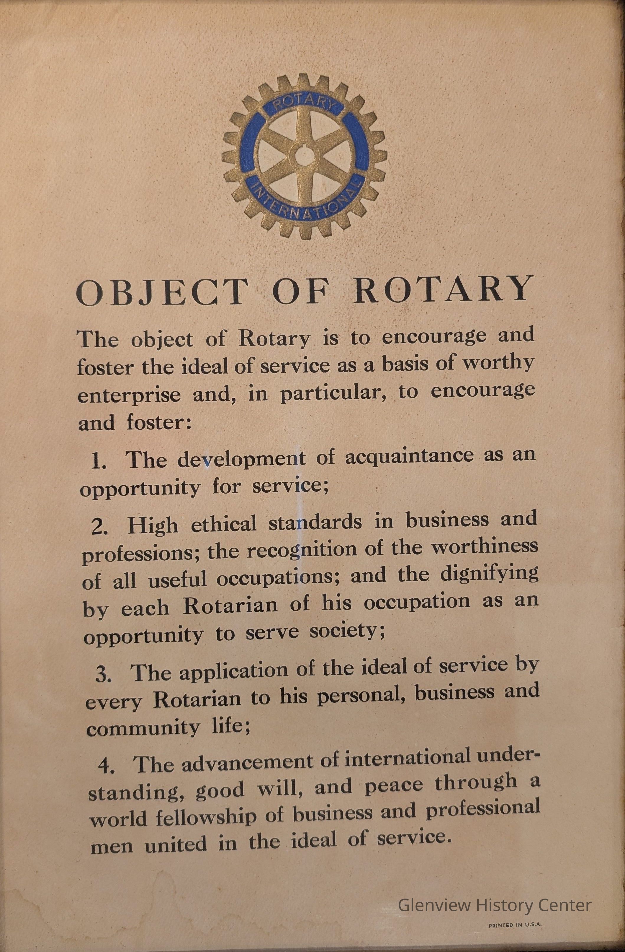 Framed document featuring the Rotarian Seal and Rotary Objectives. The names of Fred Rugen and Floyd Rogers are written on the back.Context