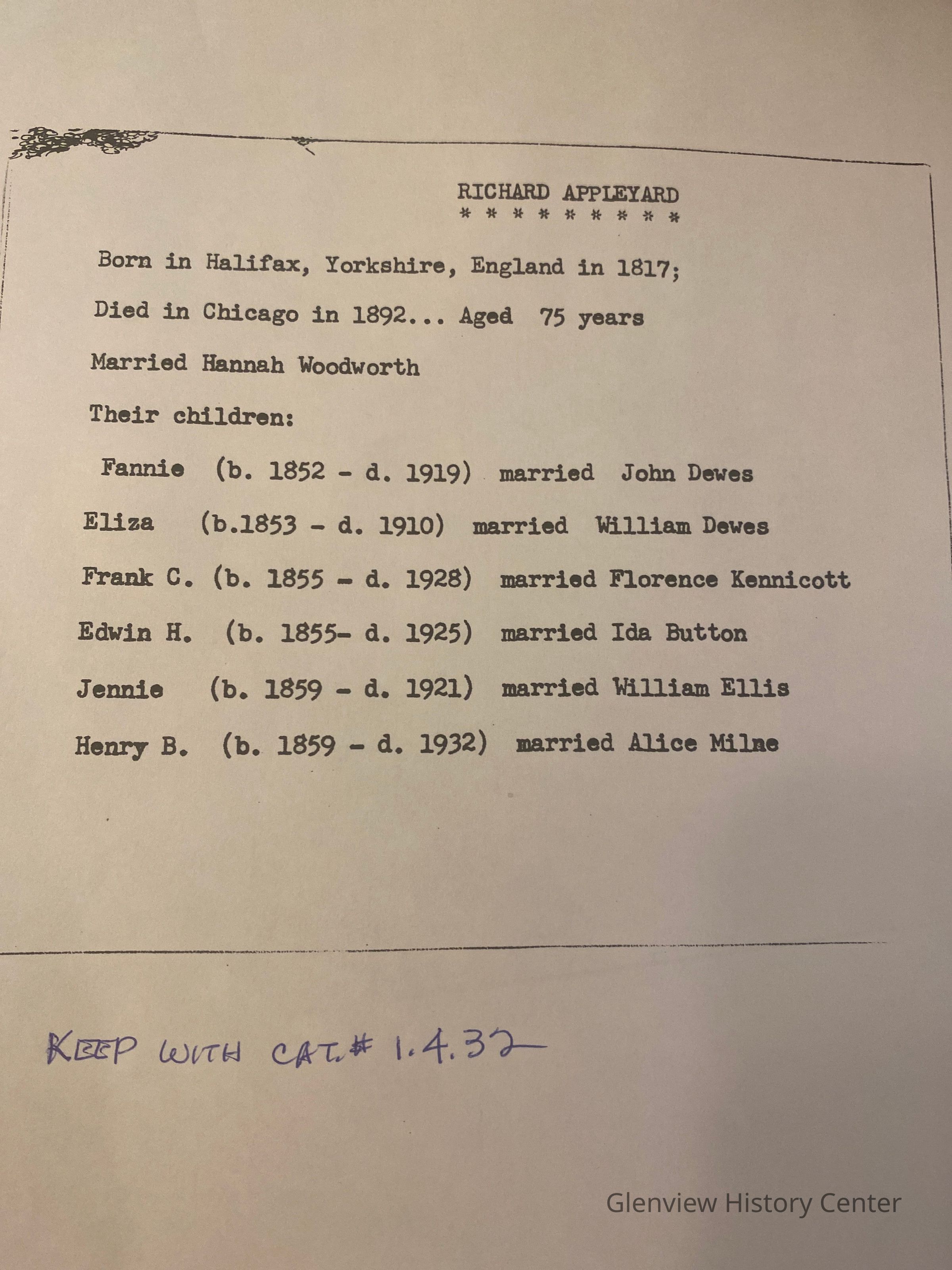 There is a list of genealogical information about Richard Applegate including wife name, date of death, children's names and who they married. It says keep with 1.4.32 but there is no form for 1.4.32 so not sure which item it relates to.