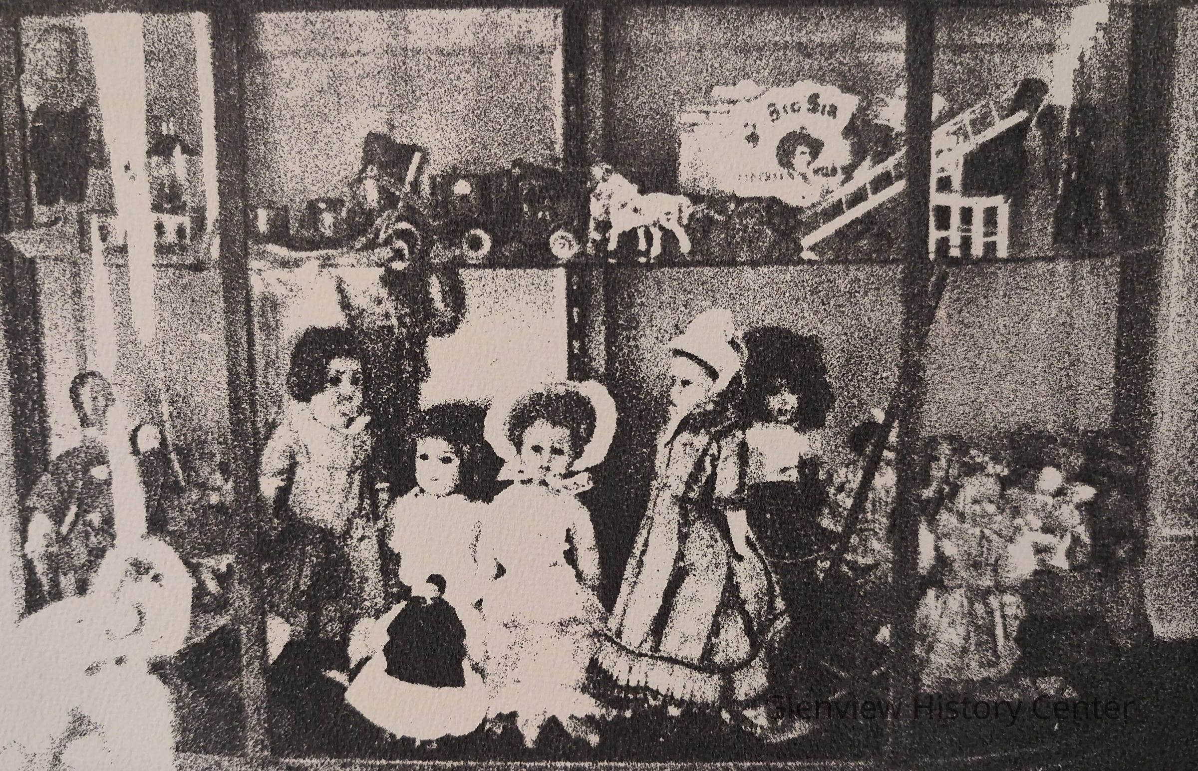Photo serigraph of a toy exhibit at the Glenview Historical Society from the 1970s.