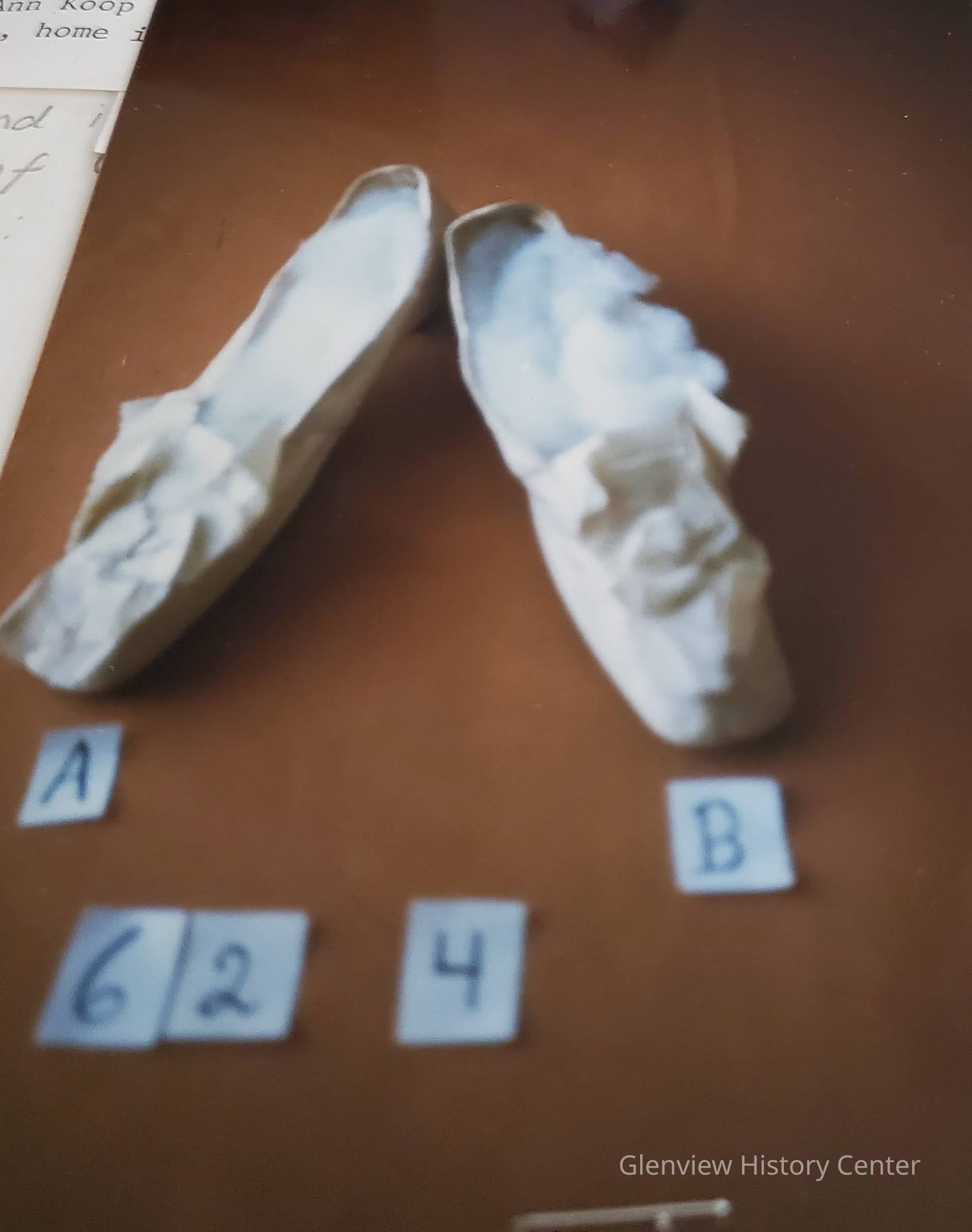 White satin shoes with fabric ribbon bow with pinked edge; 1" heels; leather soles are cut as straights with small heel attached.Acquisition