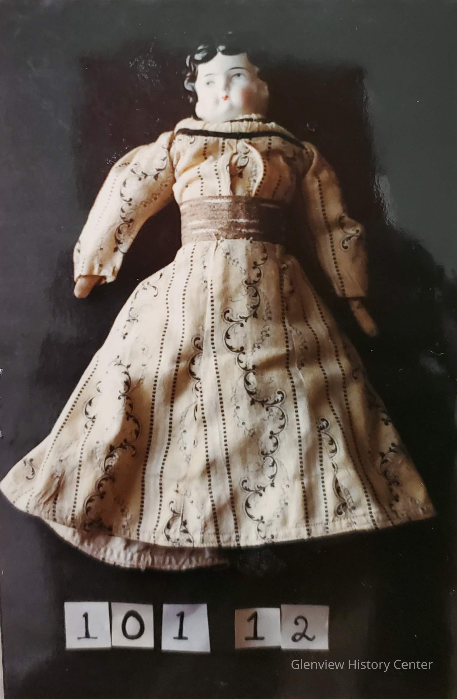 13" doll with china head, painted black hair; stuffed body with mock hands. Costume: cotton yellow, black print; pantaloons, petticoat; knitted gray boots.