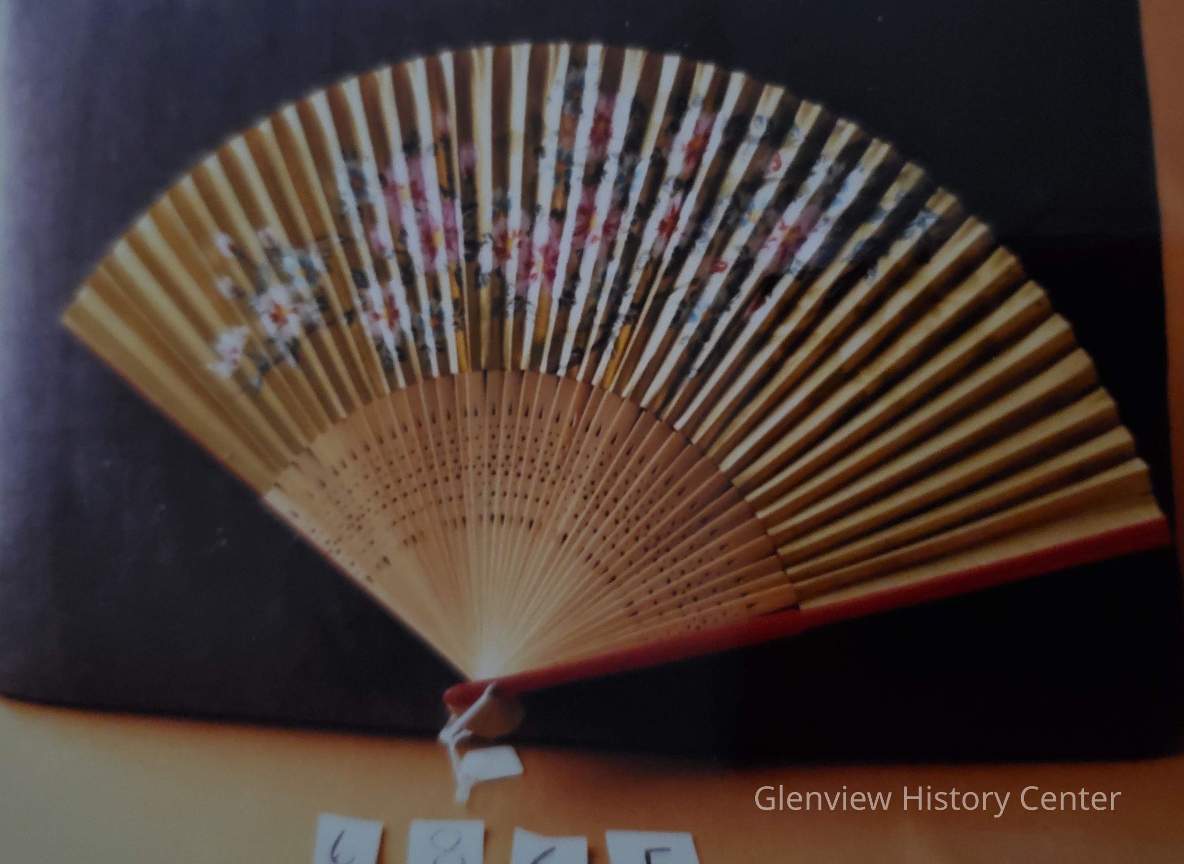 Painted paper fan with end sticks painted red and leaf design with a background color of gold with pink, blue and white painted flowers and green leaves.