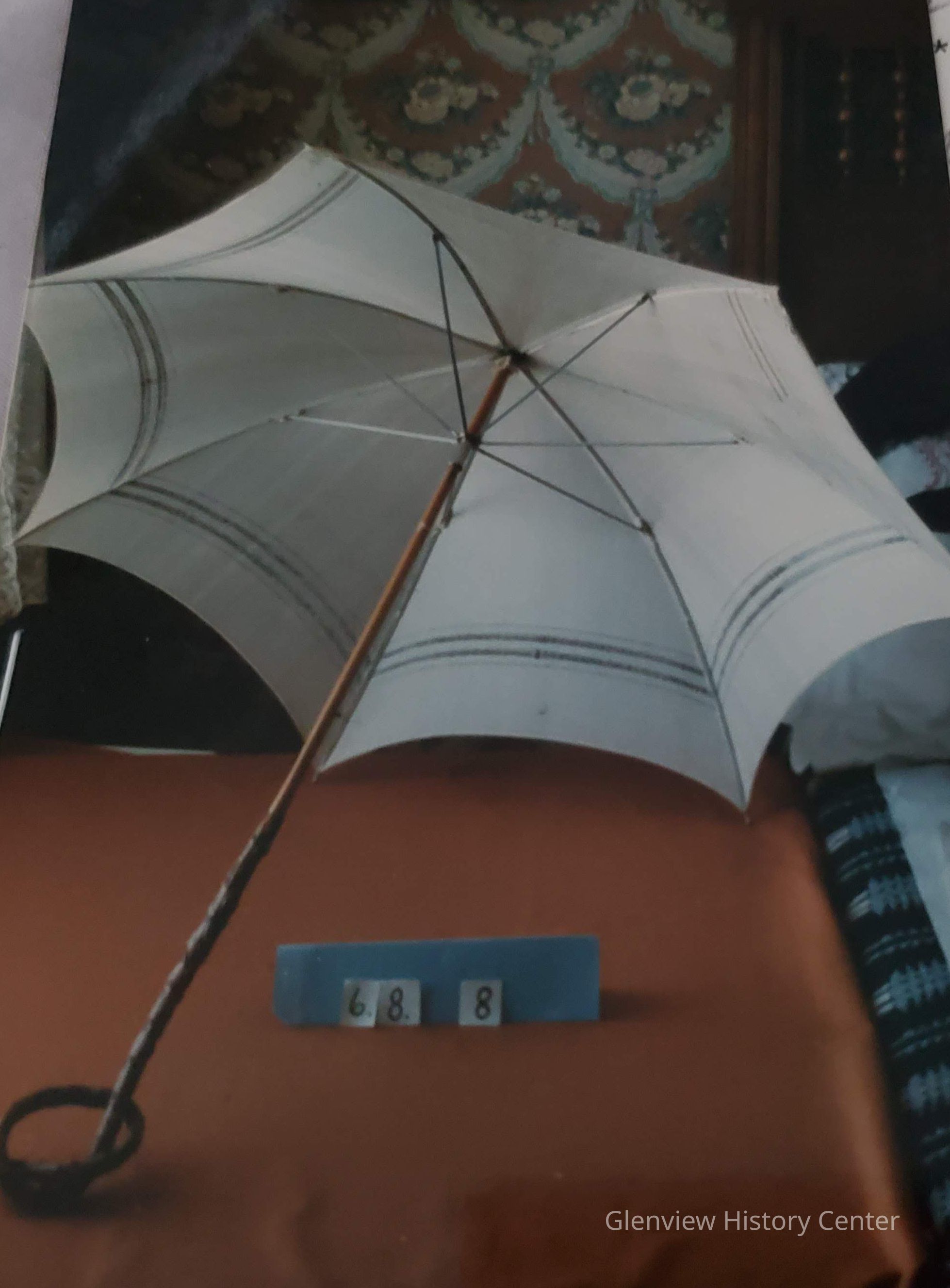 Off white silk with stainless steel ribs which are very ornate. Handle is of beige plastic (twisted twig) simulated to appear as leather.General Notes