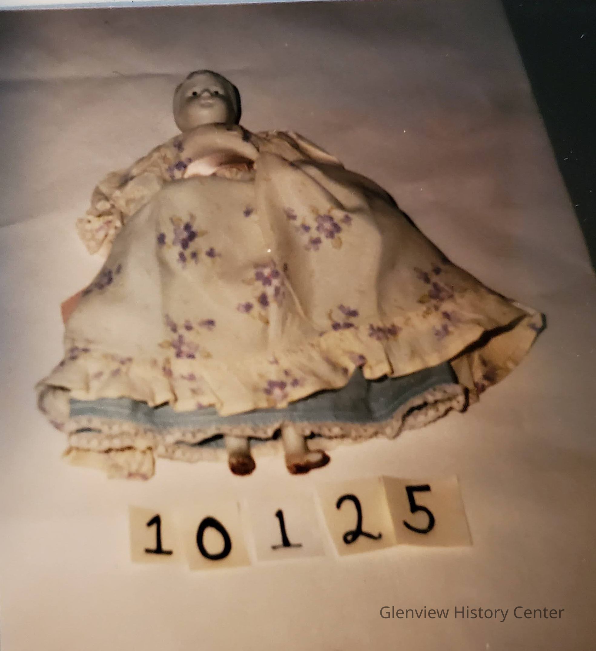 8-1/2" Parian ware doll with molded unpainted hair; Stone bisque head, arms and legs (looks like marble); Japanese machine made. Costume: Silk dress with ruffles; pantaloons; petticoat with lace and tatting edge.