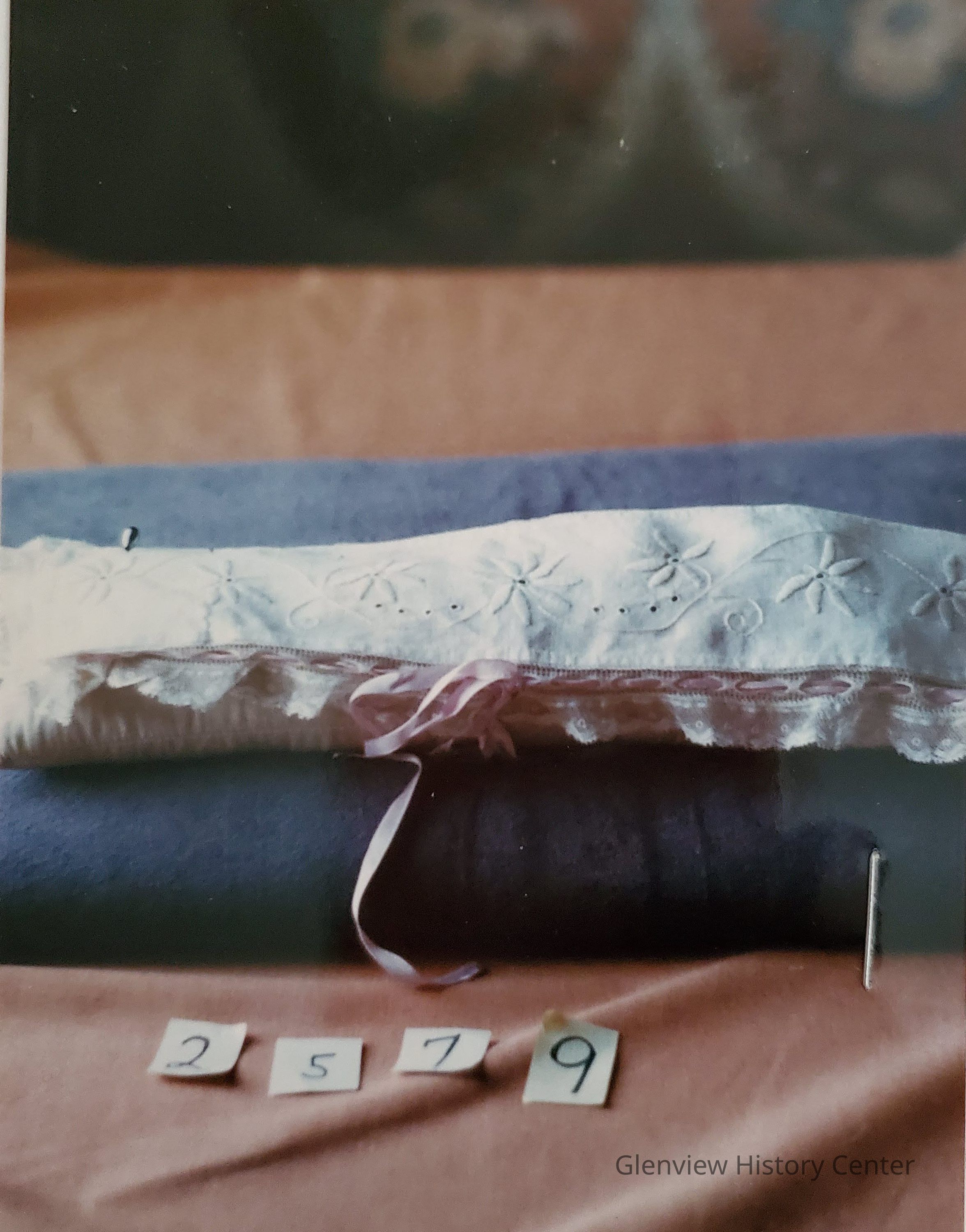 Pin cushion cotton and lace with orchid ribbons thru. Satin stitch.