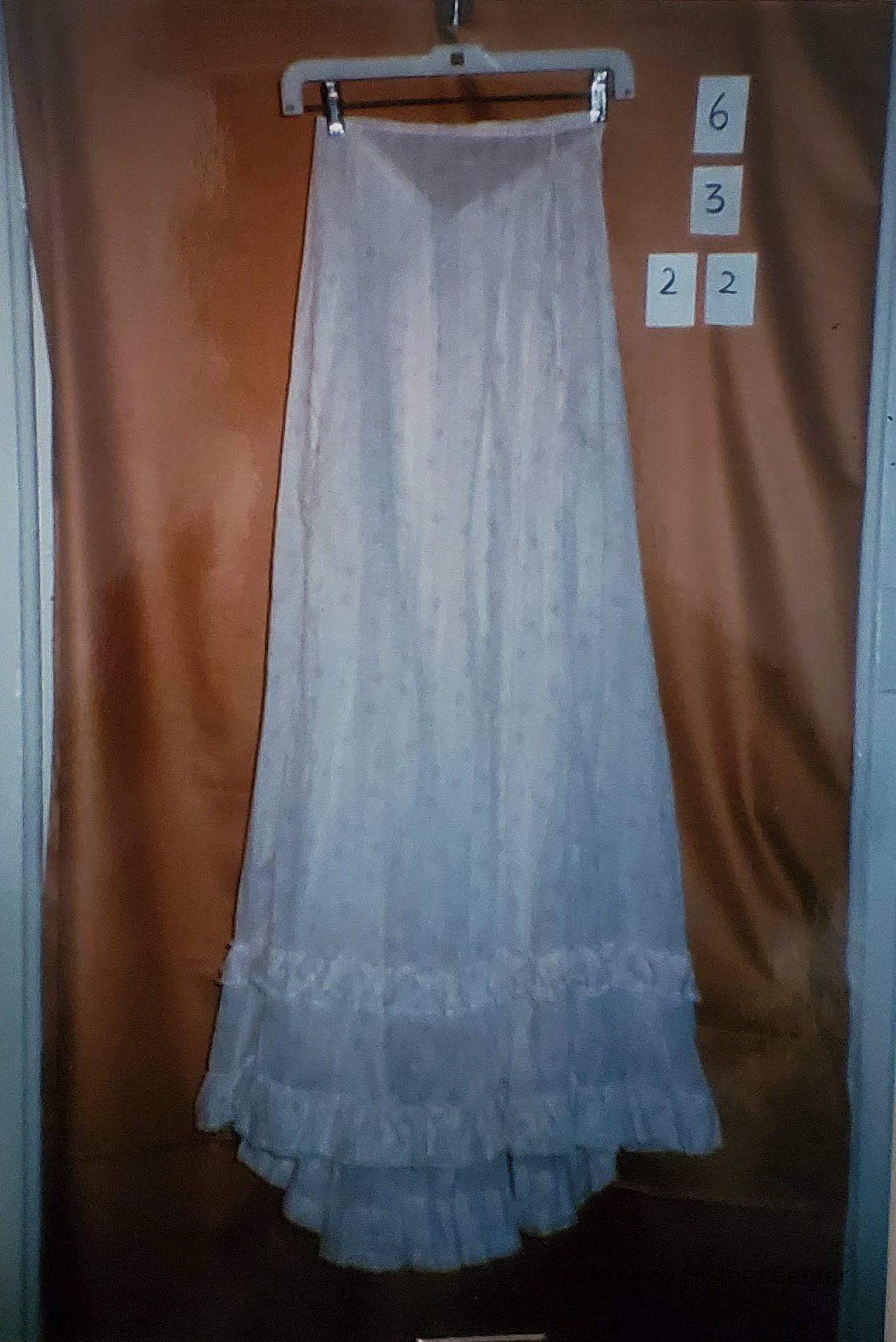 Pink and white fine cotton print bustle skirt; long 42" length style: 7 gores (2 in. back for bustle): 1" machine stitched waistband with 3 large brass hooks and eyes. 2 rows of 2" ruffles with lace trim top ruffle is 8-1/2" from bottom of hem 2nd. row of ruffles is 2-1/2" from bottom of hem; machine stitched 1-1/8" wide hem.