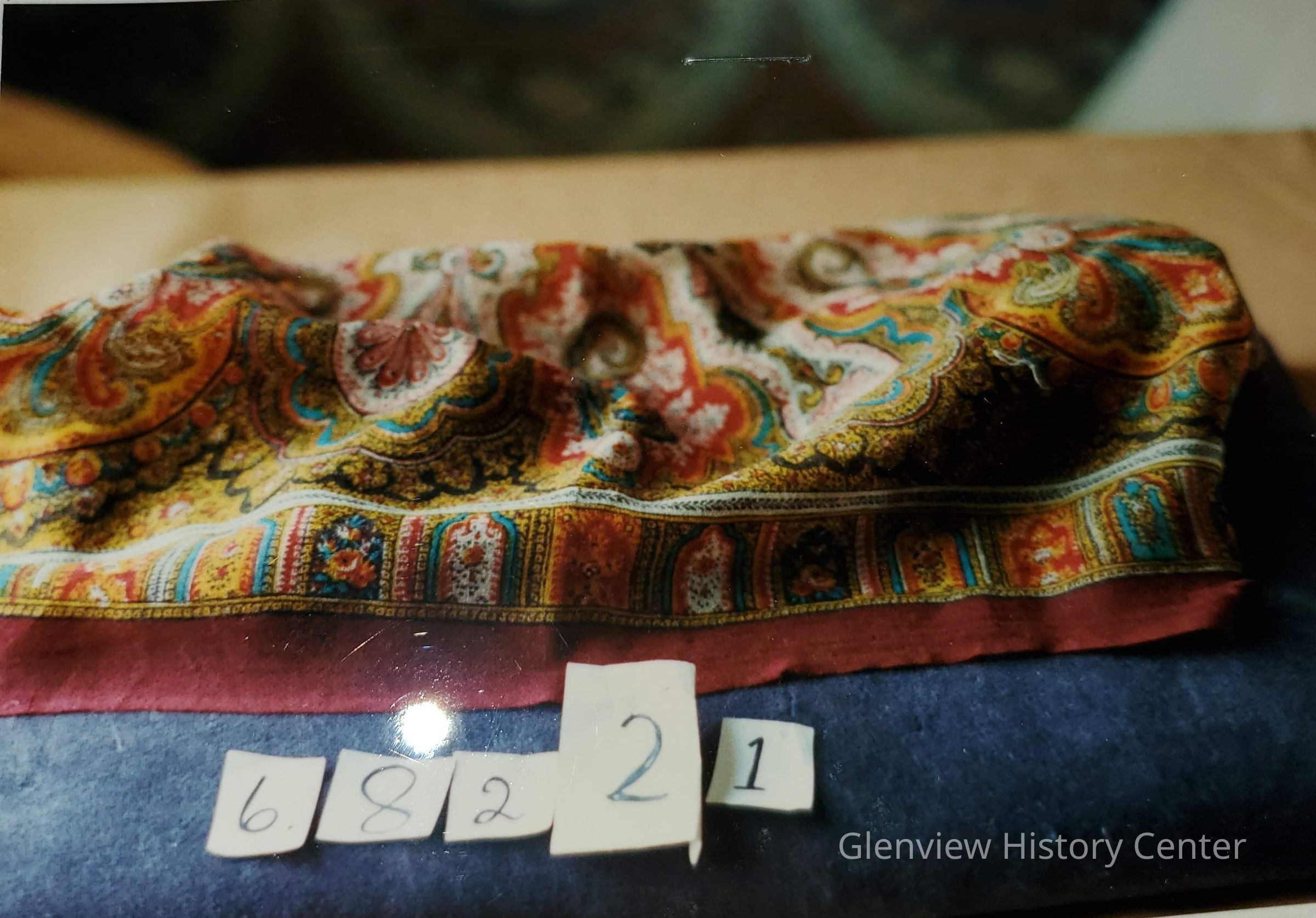 Paisley print with maroon 1/2 in border. Maroon, rust and green etc.