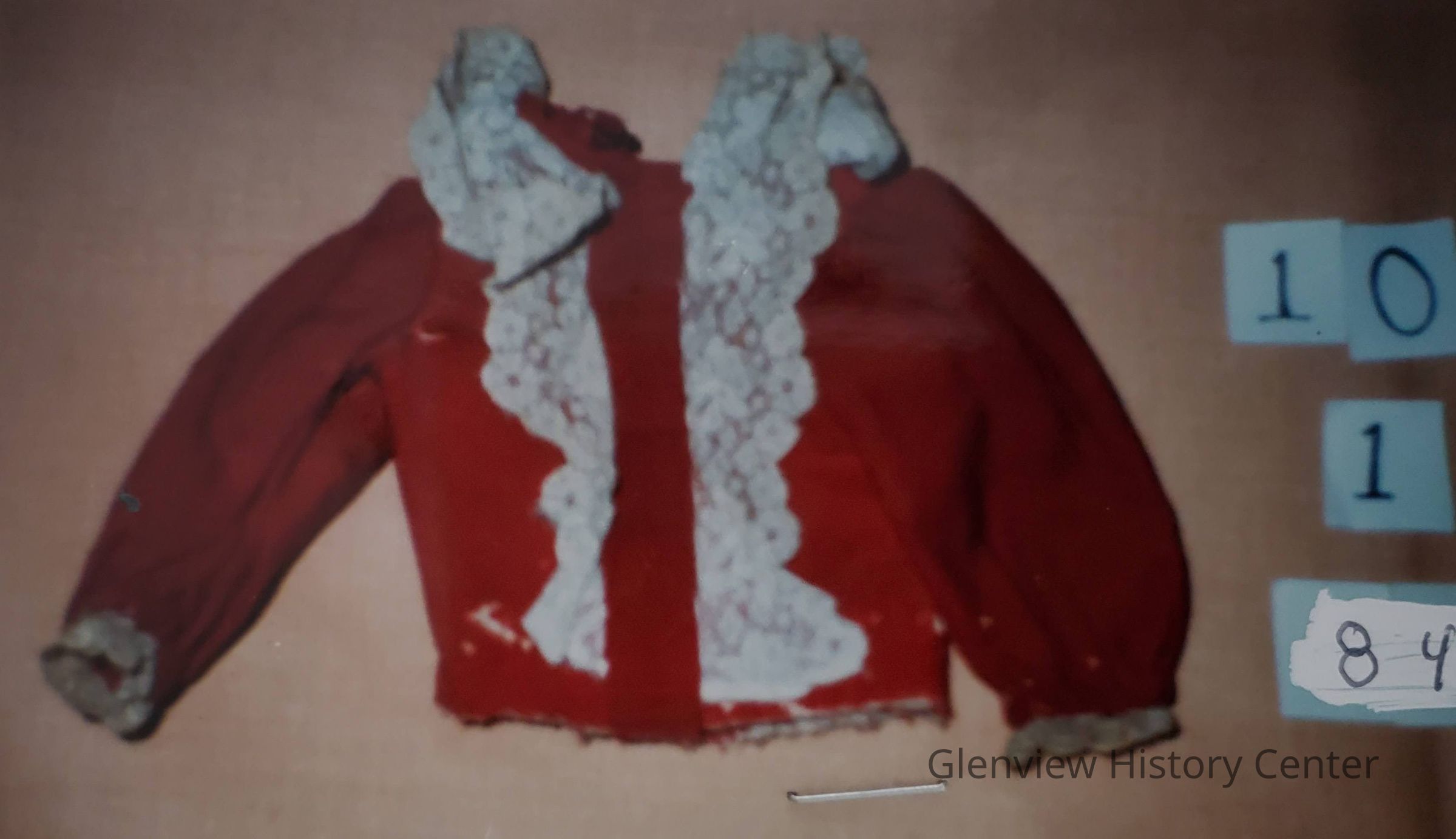 Waist length red jacket with white lace around neck and sleeve cuffs - also down both sides of front. Two buttons down back; one hook at neck area. Beige colored lining fabric.