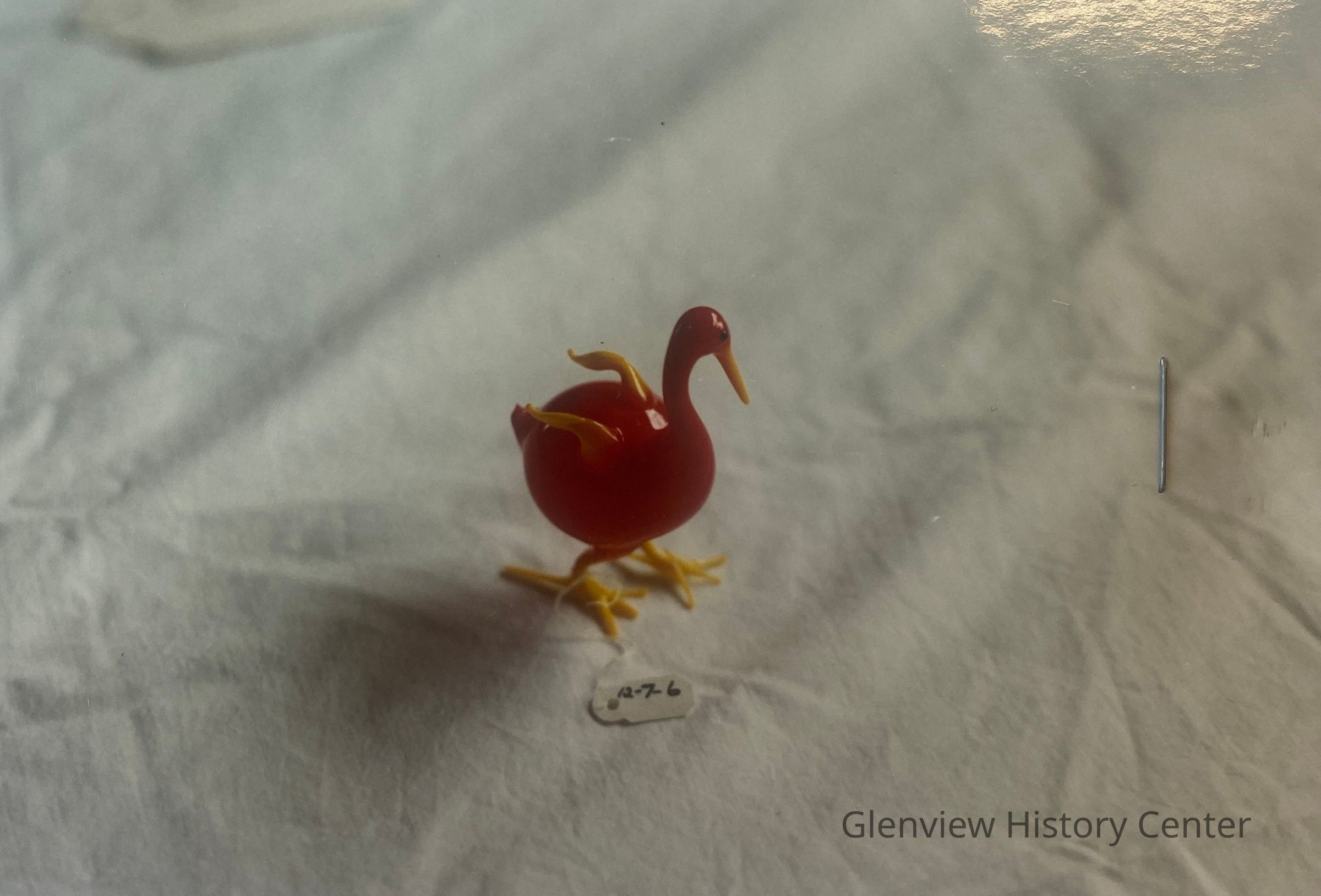 Hallow handblown and shaped glass figurine. Body is red. Residual wings, beak, and feet are yellow. Eyes are black dots. Depicts a rhea, a large flightless bird of South America (Actual bird stands from 4-5 feet tall and weighs up to 50 pounds)Acquisition