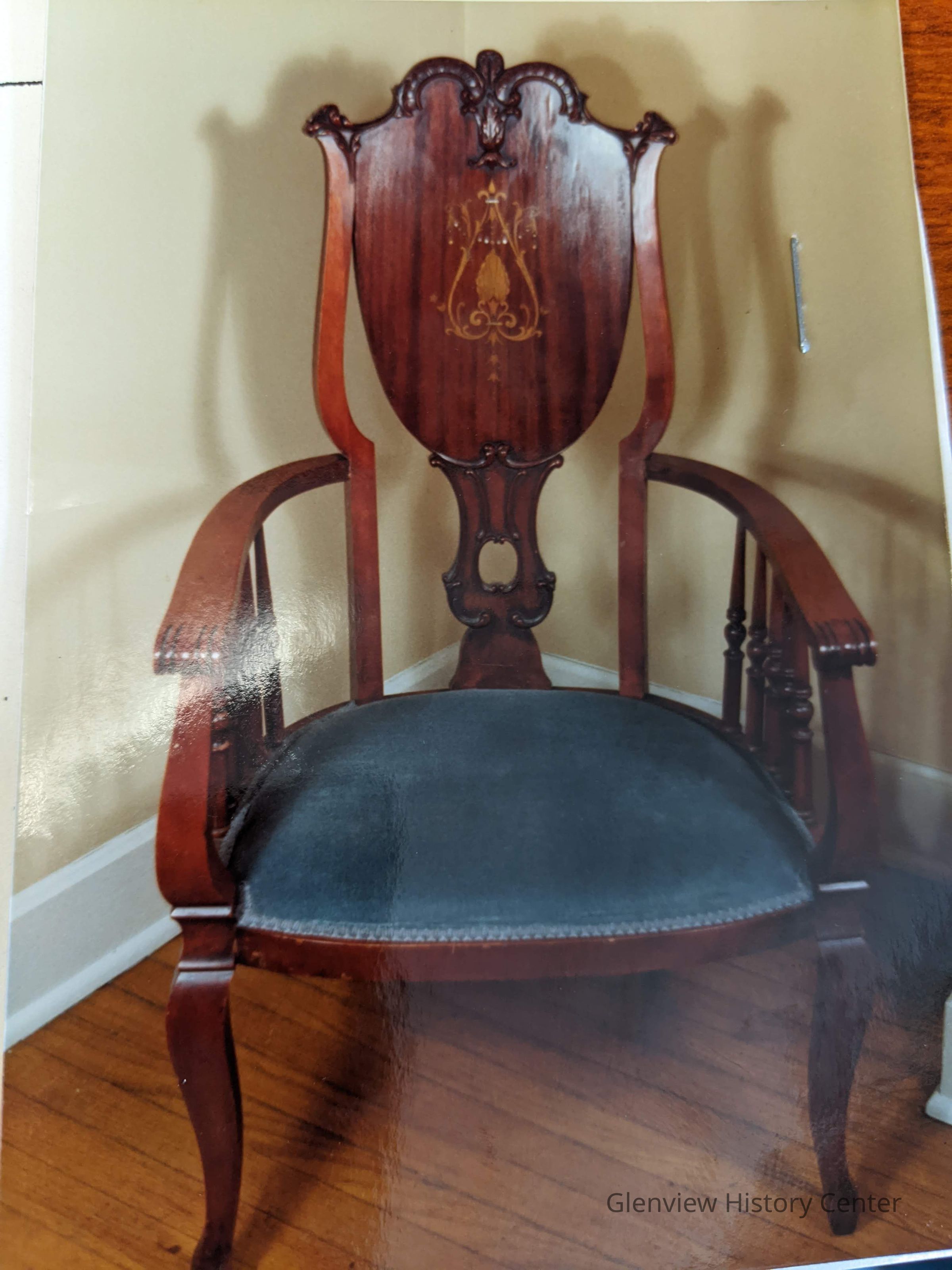 Solid mahogany chair with decorative carvings and inlaid with mother-of-pearlAcquisition