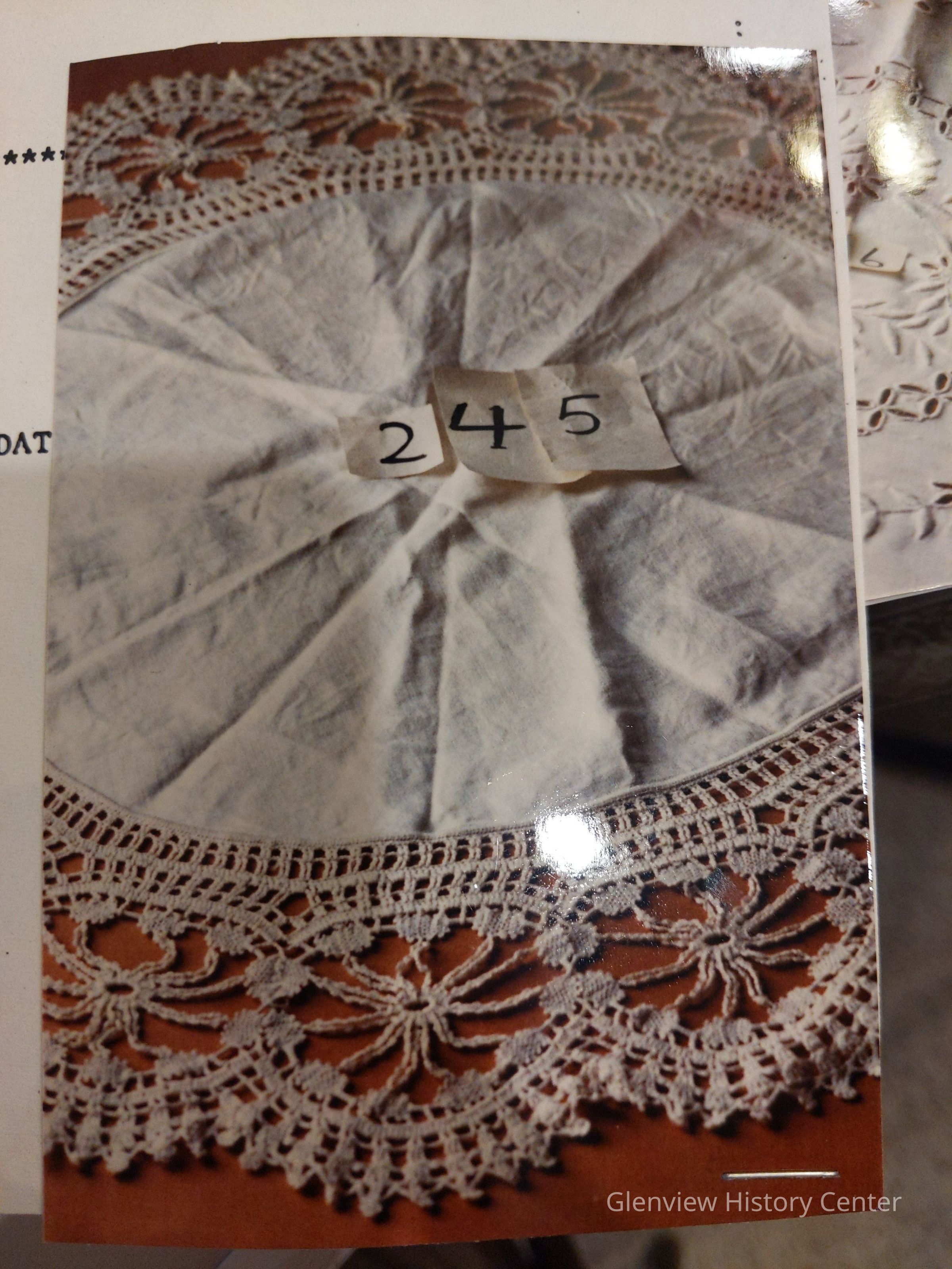 1 round tablecloth, linen center w/ crocheted open work, scalloped