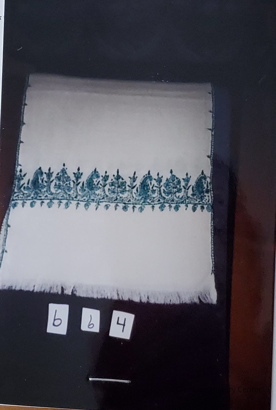 Hand embroidered cream colored fine wool scarf with green embroidered paisley design