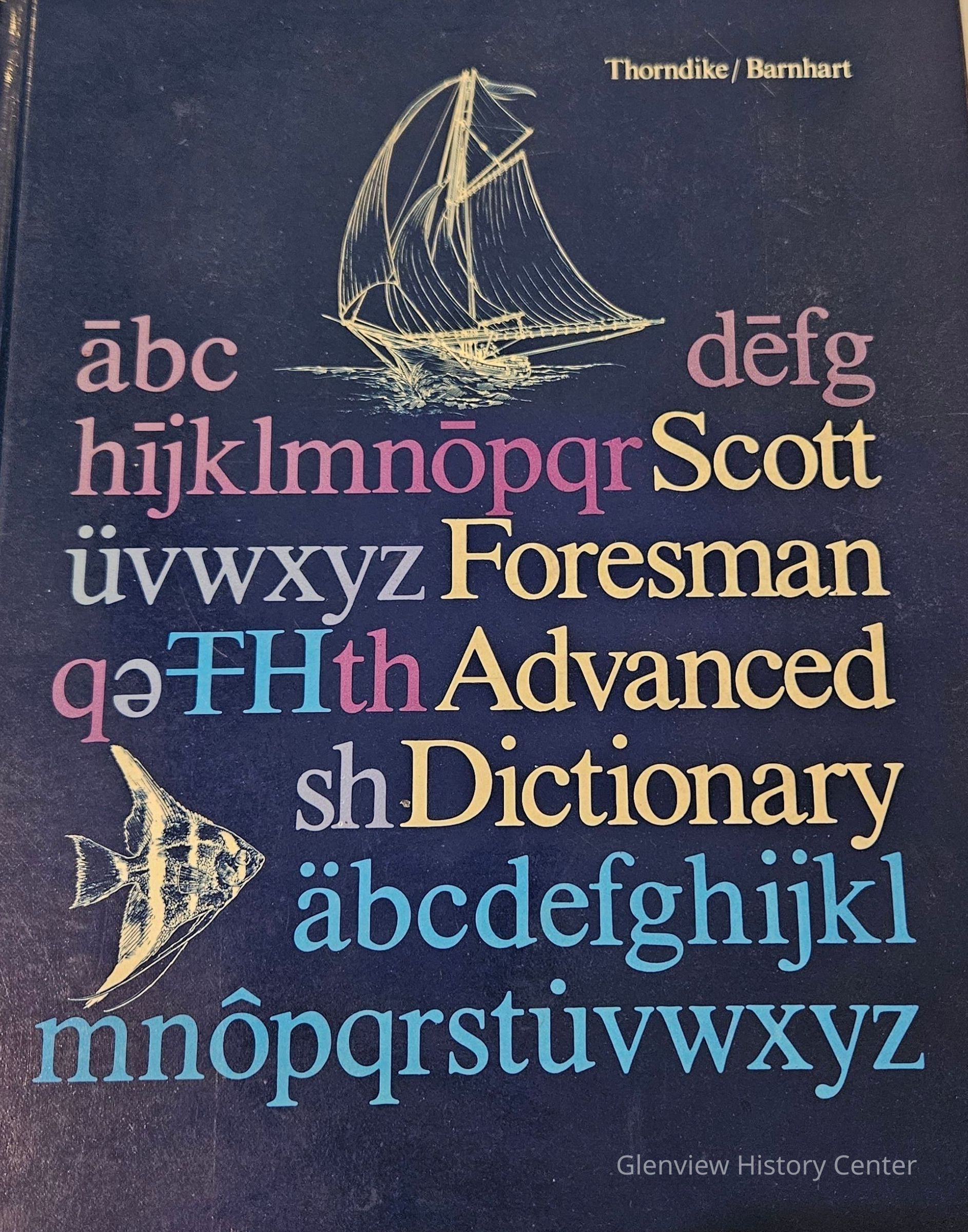 Blue hardcover book with the title "Scott Foresman Advanced Dictionary" within a group of purple, blue, and aqua letters. Images of a sailboat and fish in white.Context