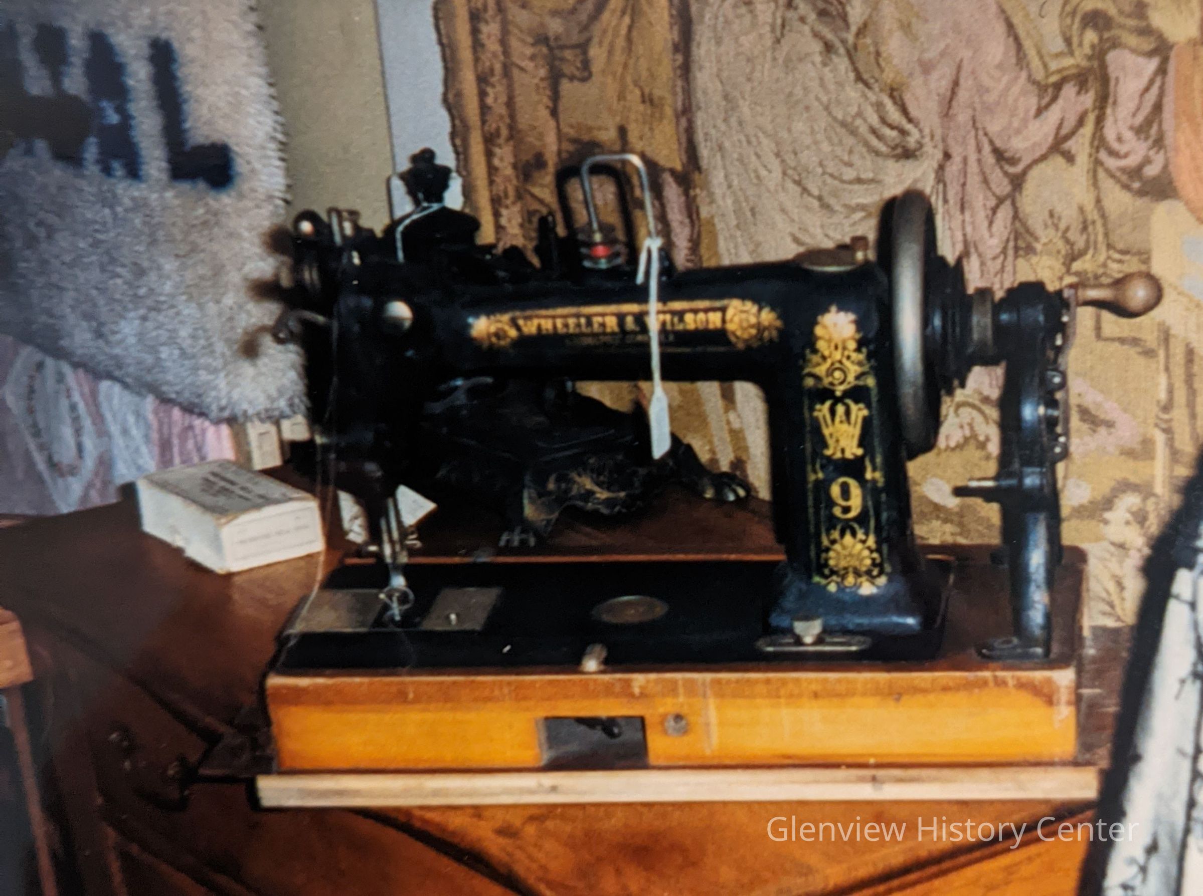 Portable sewing machine attached to a wood base with a rounded wood cover with rope handle