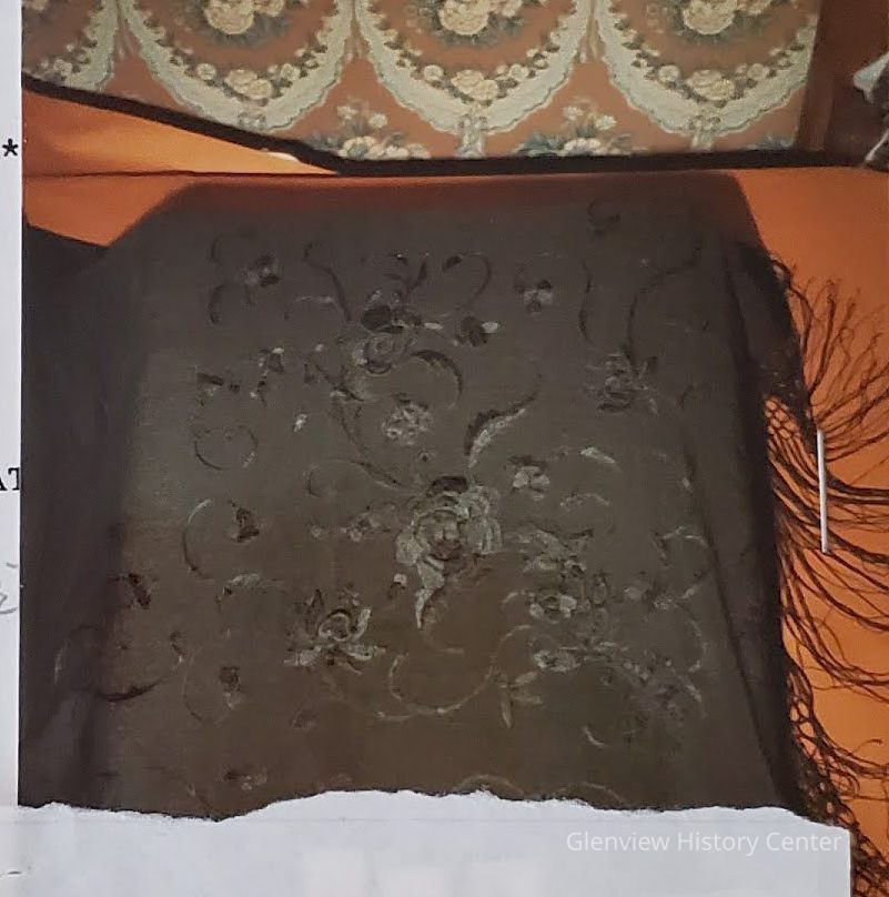 Black silk shawl with black embroidered flowers and black fringe.
