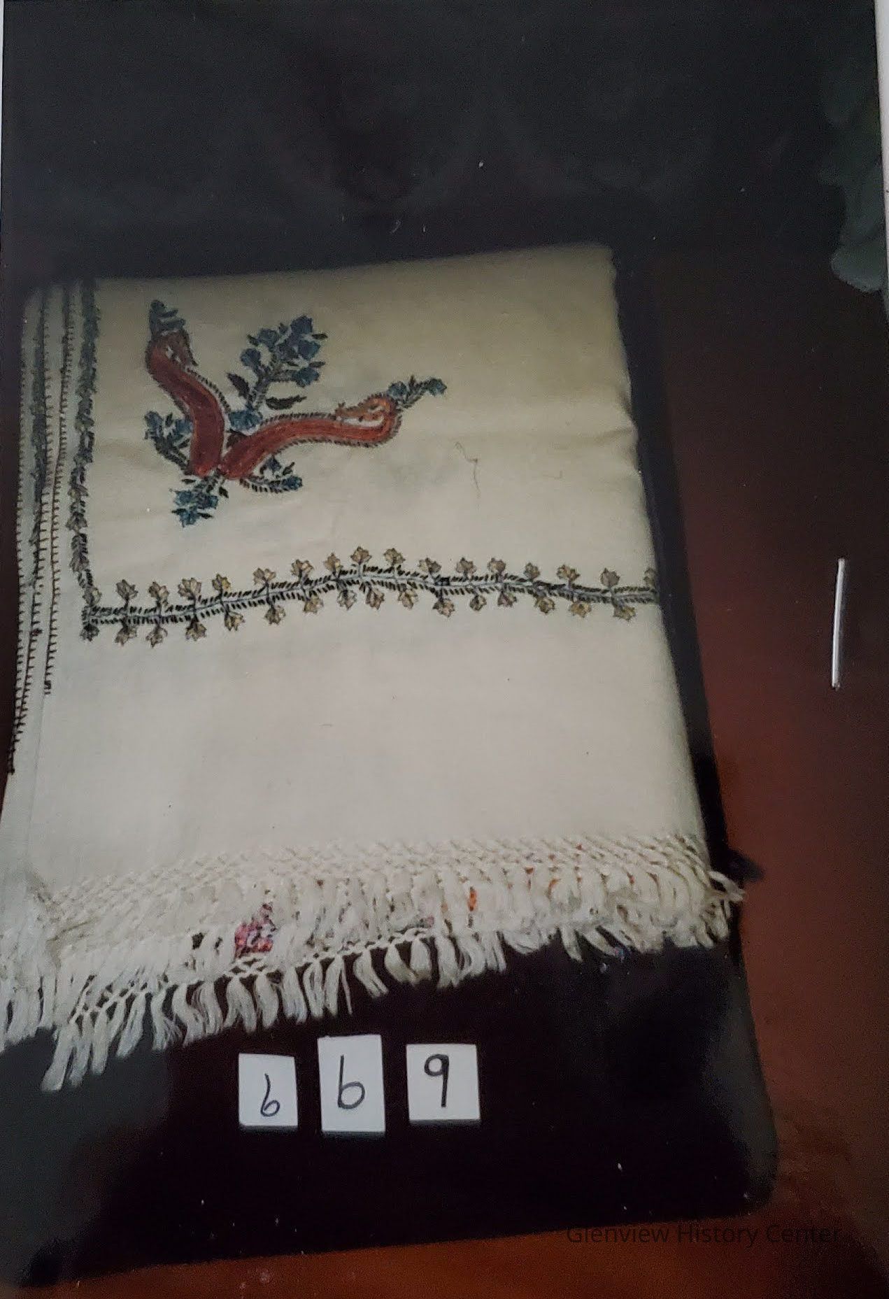 Hand embroidered shawl fine wool with multicolored embroidered flowers (blue, rust, green, navy and red) in the middle and at each corner of fringed ends.