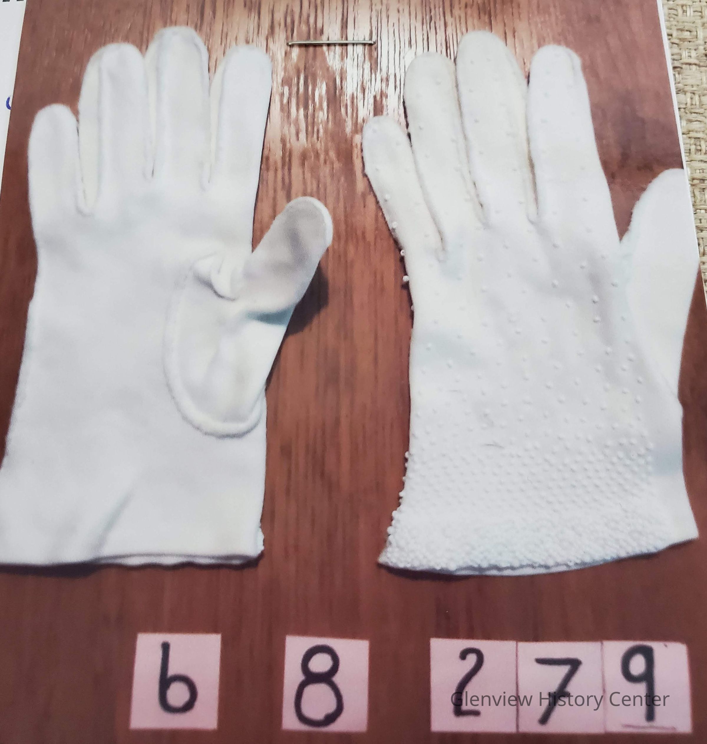 Short white cotton gloves with white beading on cuffs and backs.