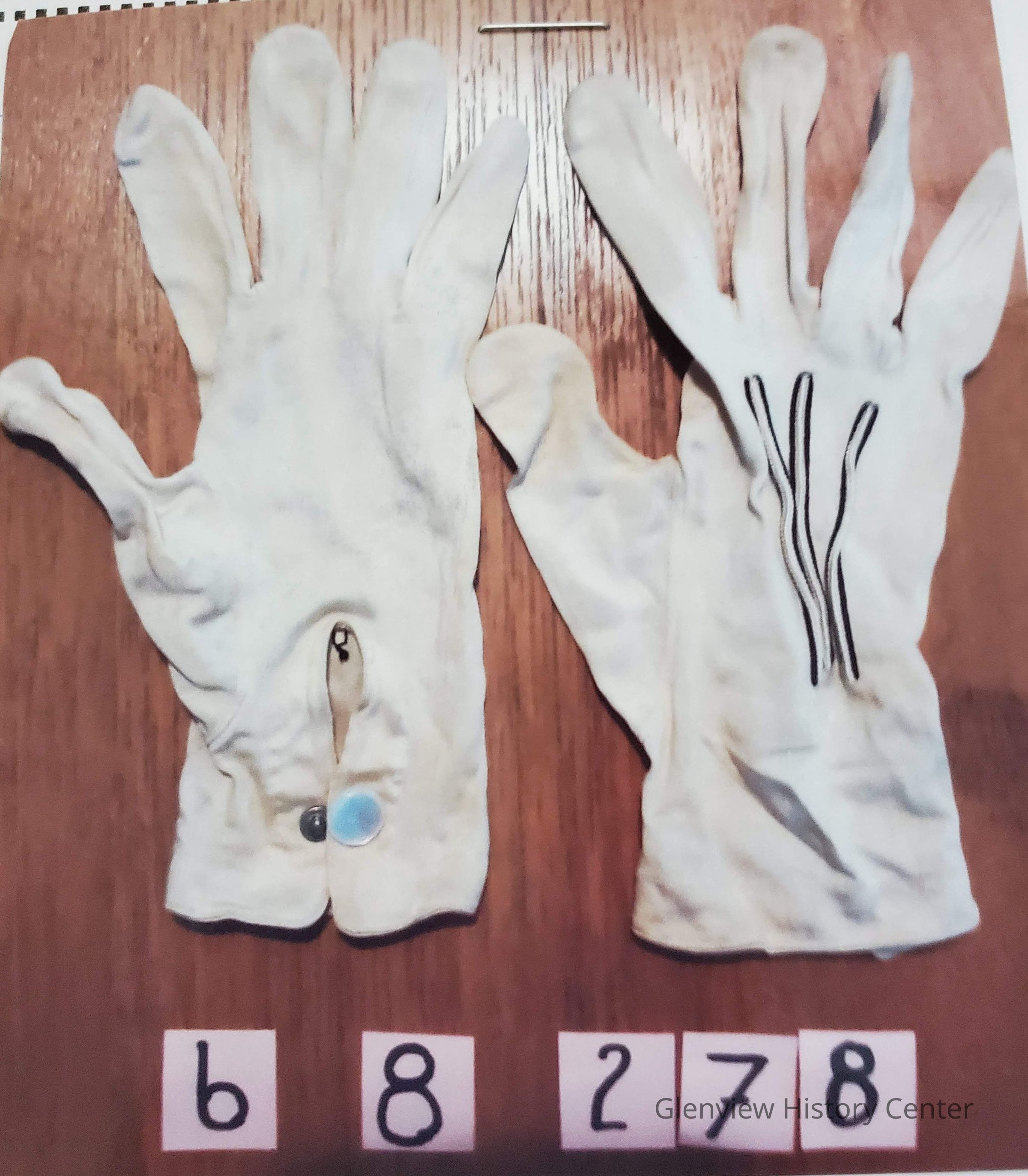 Short beige nylon gloves with pearl button snap closures. Three embroidered stripes (rays) on back.