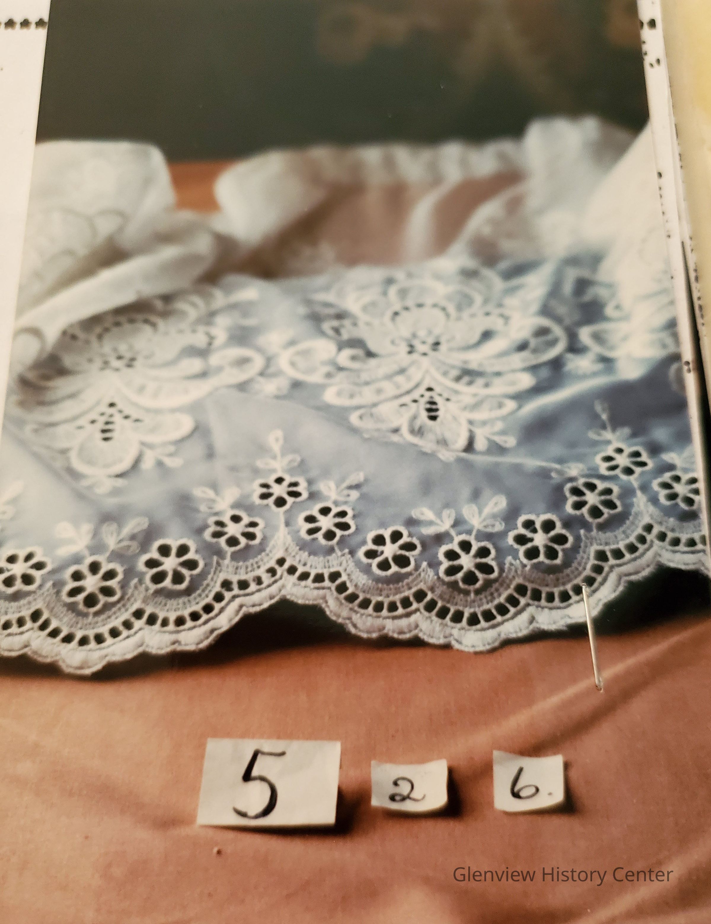 One sheer machine embroidered Iris pattern. Scalloped across bottom.