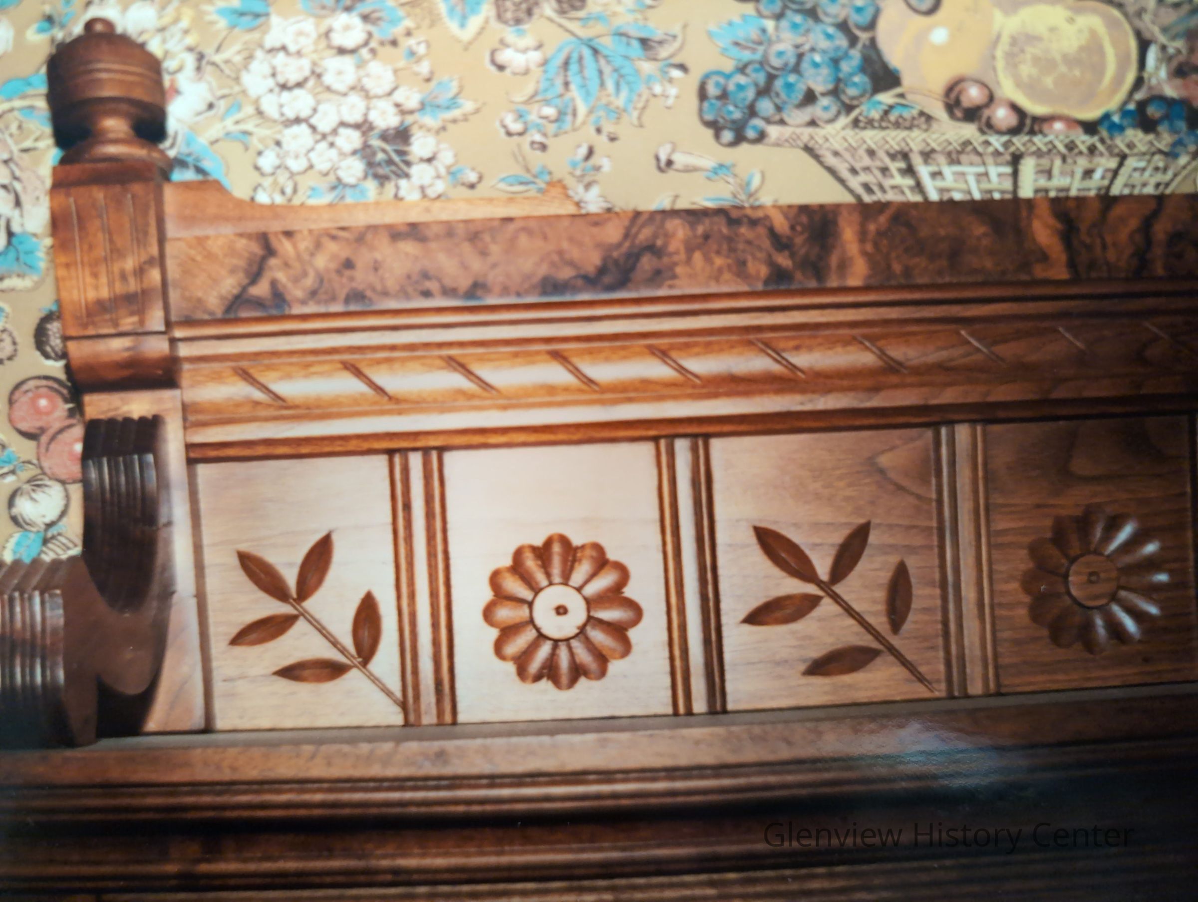 The mirror is between the top shelf and he drawers measuring 33-1/2" x 16" - above the flat section covered with brownish marble. There are on each side of the mirror two shelves 9-1/2" x 8-12" held up by circular type pegs - handles on drawers are fancy brass. Knapp joinery. Dates 1875 circa.