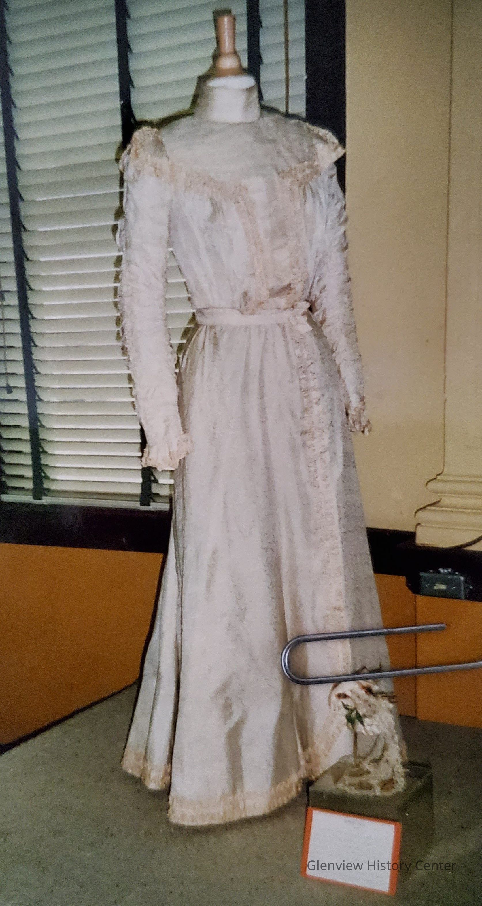 Ecru, silk skirt and top; belt 34" ecru belt; 52" belts accompanying wedding dress for use with bustle. Satin bow on bone hairpin; Fan.Acquisition