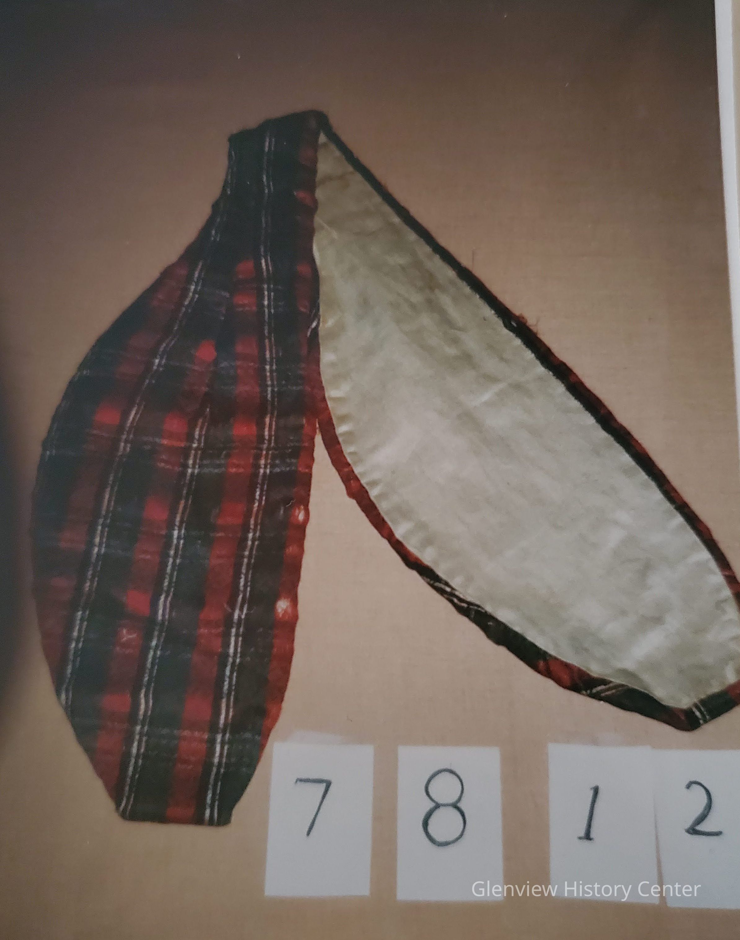 One red, green, beige striped silk tartan ascot, padded (man's) 36" long narrow at neck (2-1/2") gets wider as it gets longer and is 6-1/2" wide at about middle of long part, is curved on two sides and straight on two sides. Red stripe hem 1/2" float, beige silk lining.Acquisition