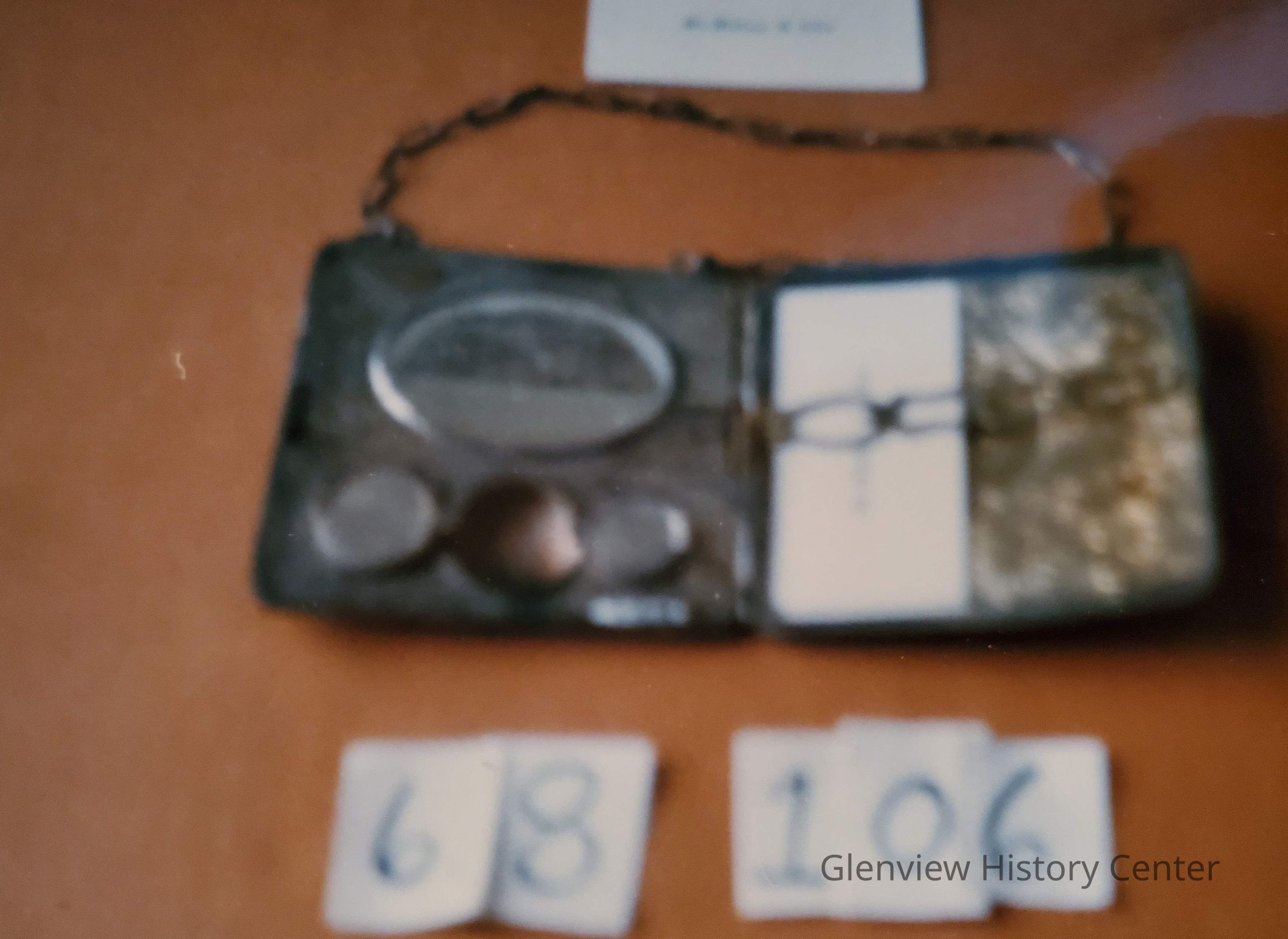 Exterior very ornamental with beautifully carved (stamped?) flowers. Interior has three circular compartments graduated to hold nickels, quarters and dimes. Hinged compartment with an oval mirror set in front. Opposite side has a clip in which to hold calling cards or money.Acquisition