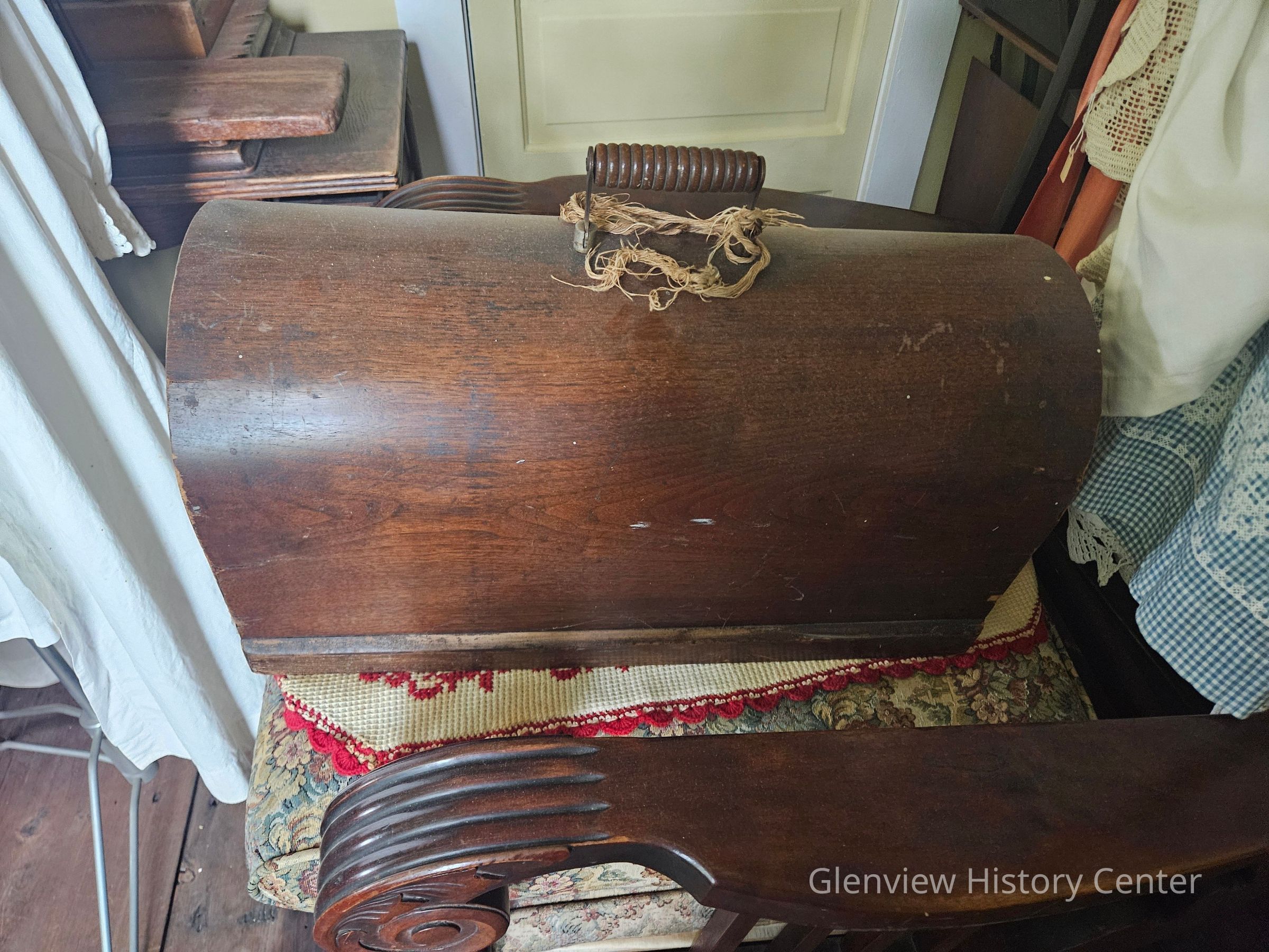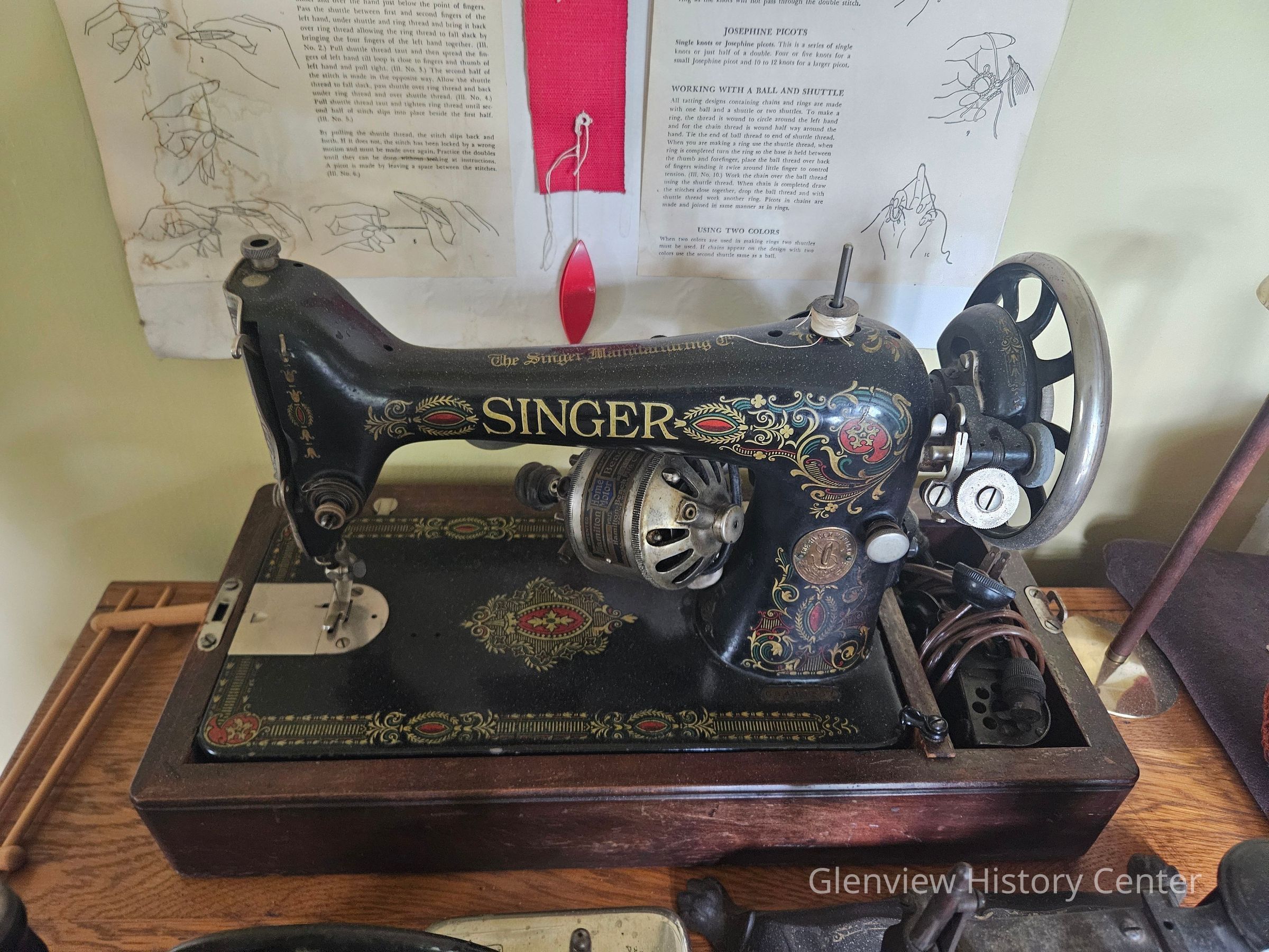 Decorative singer sewing machine w/ travel case. Sewing Machine #GE498357, with Hamilton beach home motor, Pat. Sept 18, 1917. With foot pedal, sewing light - electric with bulb. wood two piece travel box, lockable topAcquisition