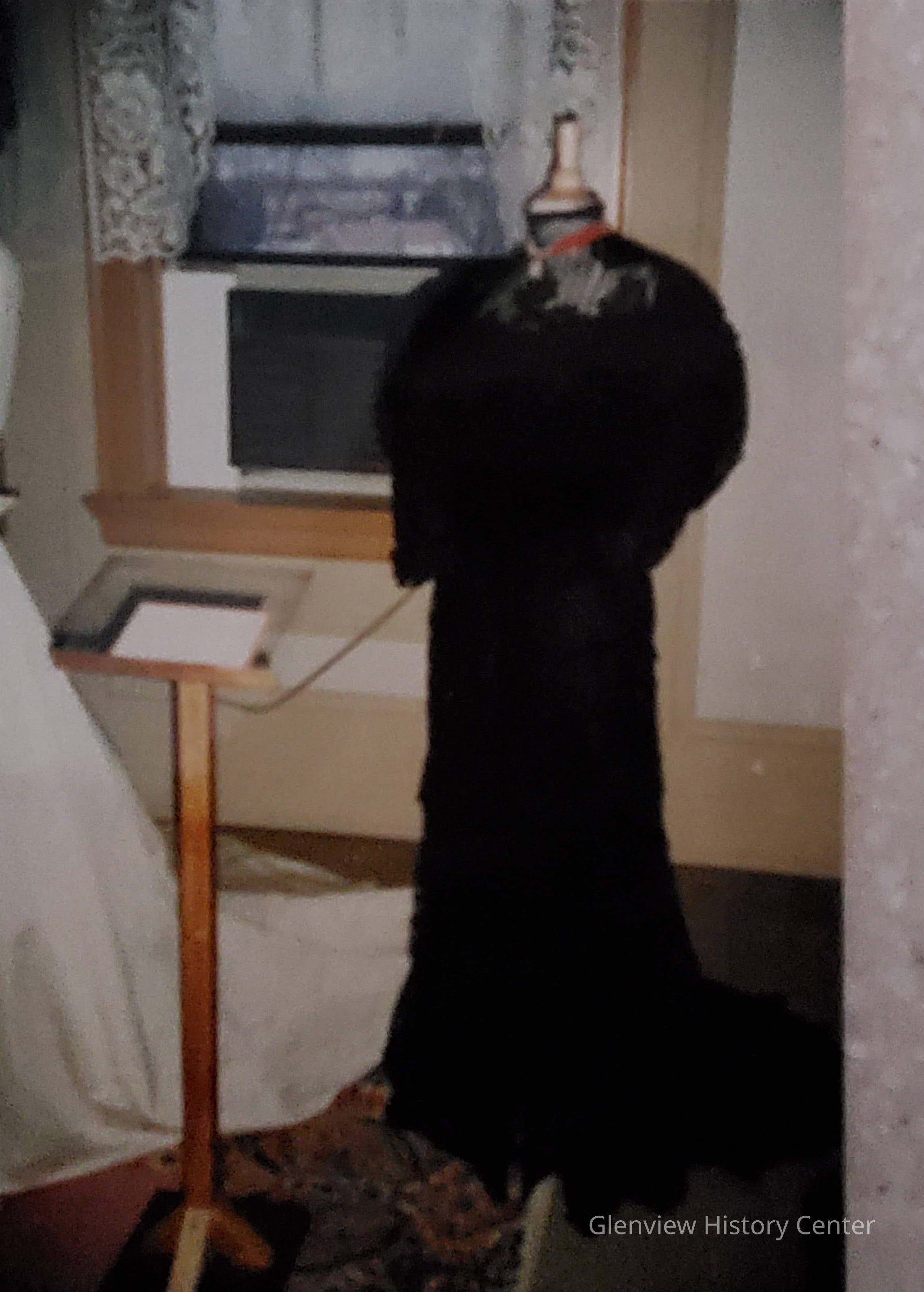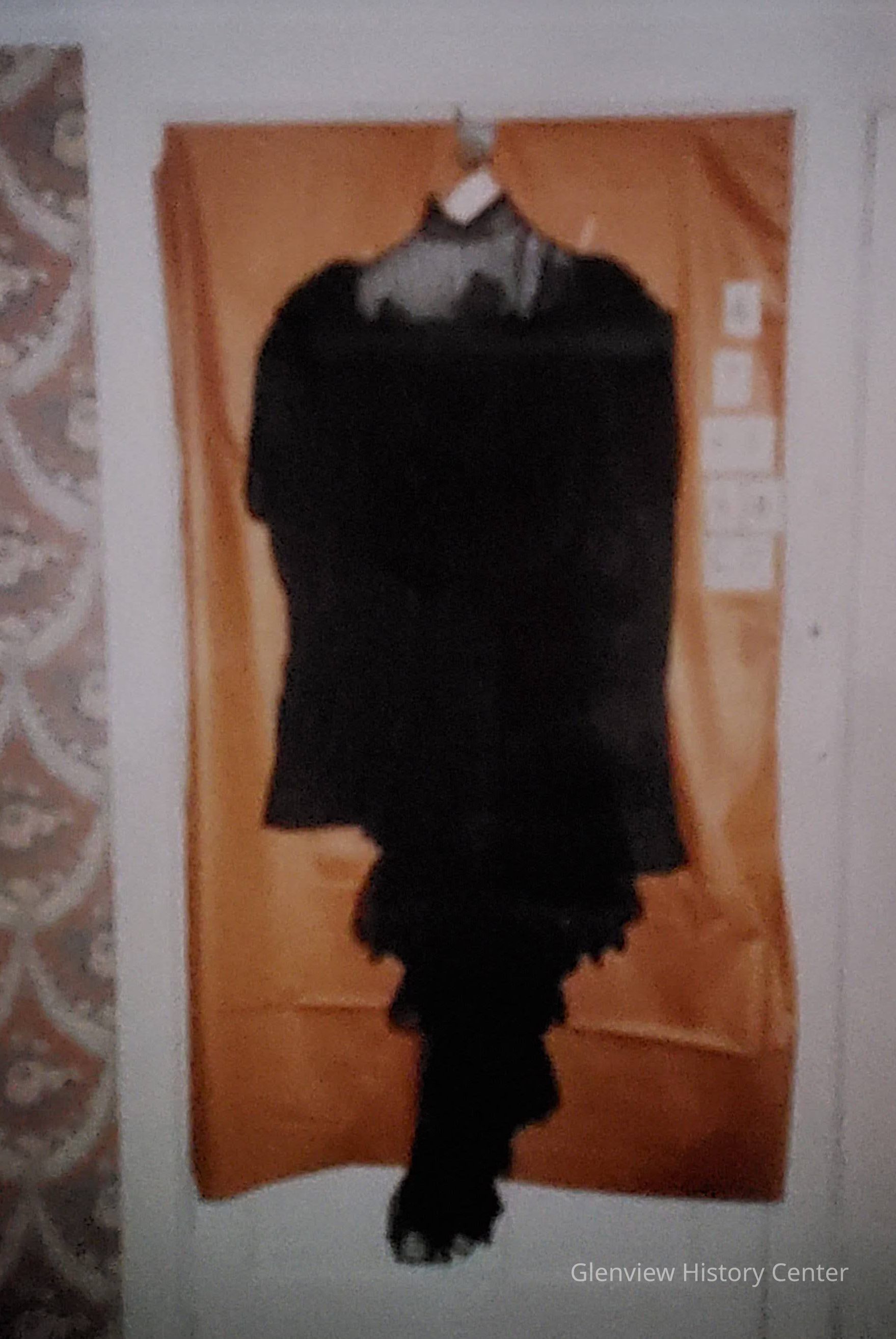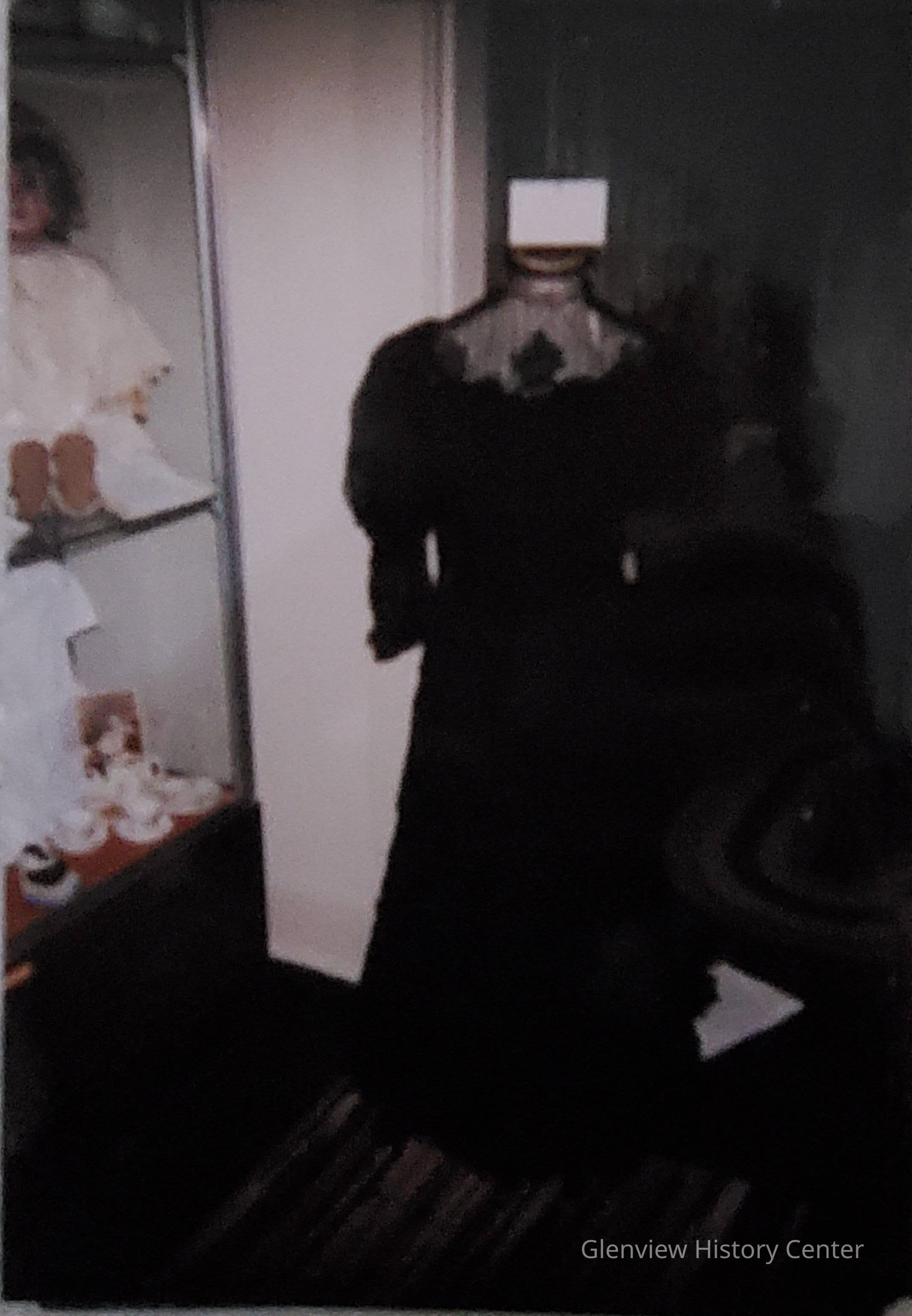 A) Bodice top: 3" stand-up open lace collar with 1/2" white satin sewn behind small top ruffle of black lace; wire stays at shoulder line hold collar firm to neck; Leg-of-Mutton sleeves: outer layer of lace has the exaggerated puff sleeve 15" from shoulder to double edge ruffle below elbow; and extended sleeve of 4" of net lace has a twisted thread interlaced through open lace holes in a diagonal direction around arm; end of sleeve has a triple ruffle with a scalloped edging. Rectangular 4" X 3" lace epaulet over the puffed top. Bodice top is open lace with a sheer organdy under-layer for the top 5" of top; above bustle line is an appliquéd black flower and bow lace which extends to 5"; lace is left free; Under bodice is of taffeta, style is strapless sewn to lace; 11 bones sewn in by machine.