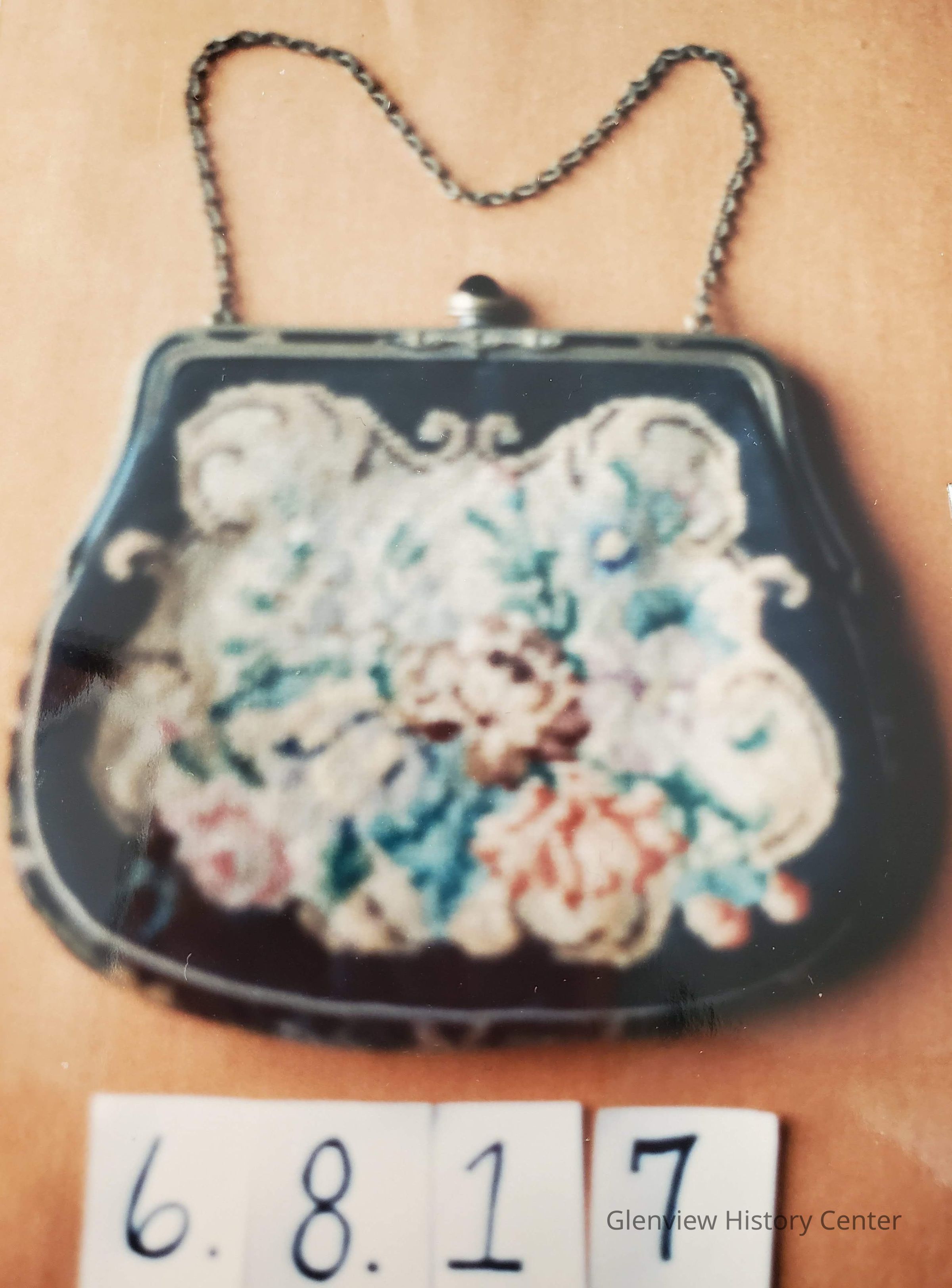 Cotton floral petit point bag with black background surrounding multicolored design. Metal enameled frame with black glass clasp and chain. Beige lining and cording. Small interior pocket with mirror.Acquisition