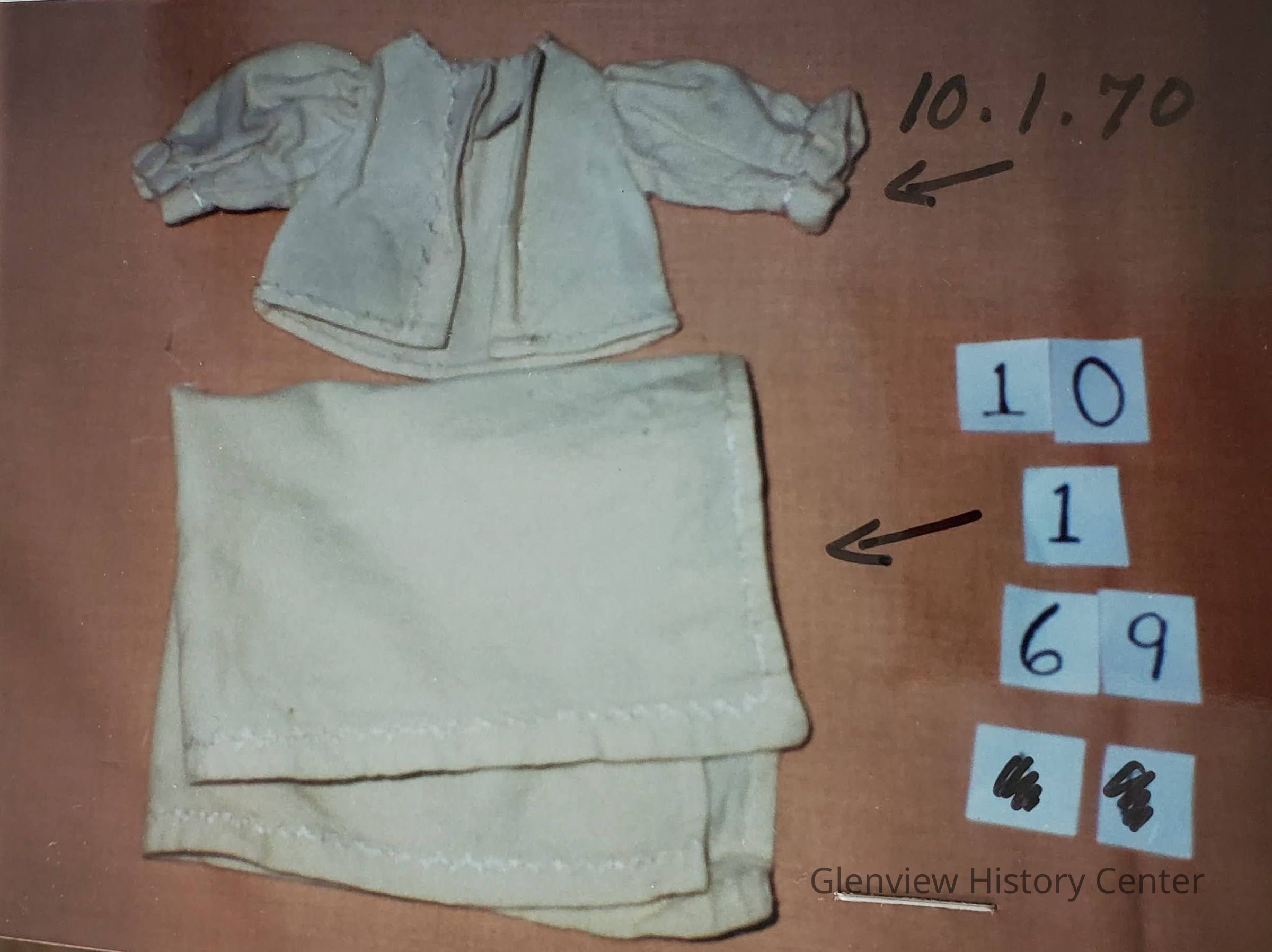 Small cream colored wool jacket with feather stitched edging, front tie closure. Large sleeves suggest the leg of mutton sleeves of the 1895 period.